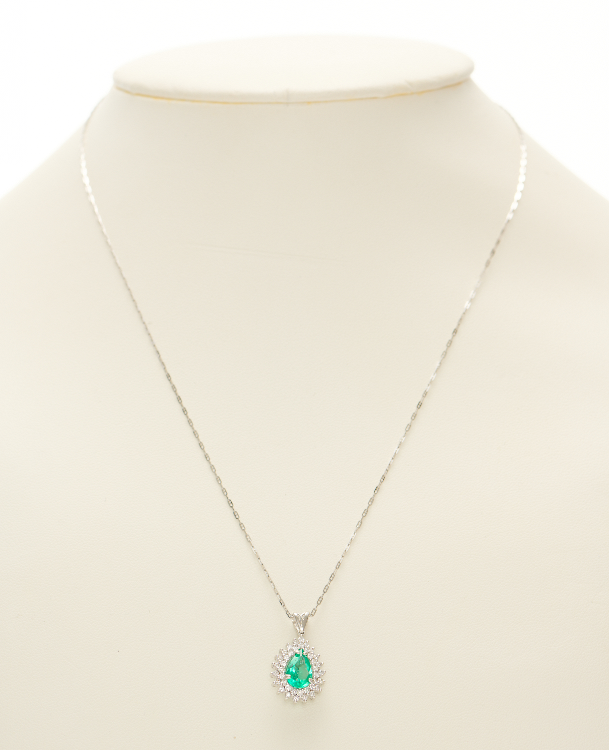 A COLOMBIAN EMERALD AND DIAMOND CLUSTER PENDANT IN 18CT WHITE GOLD, THE PEAR CUT EMERALD ESTIMATED 1.15CTS, TO A FINE TRACE CHAIN IN 18CT WHITE GOLD.