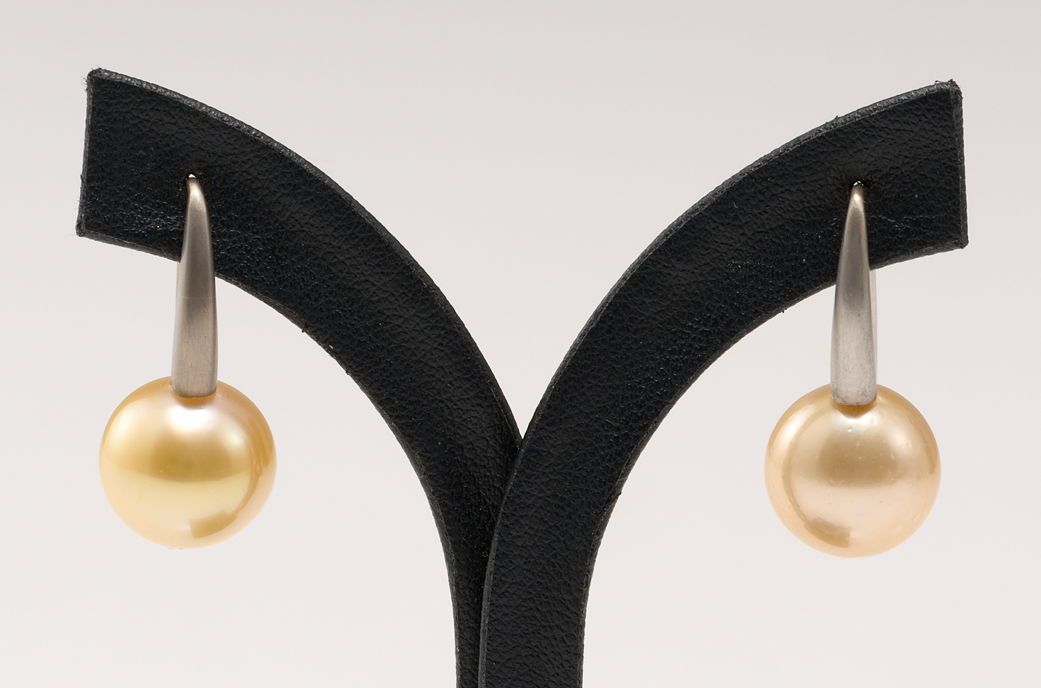 A PAIR OF SOUTH SEA PEARL EARRINGS IN 18CT WHITE GOLD, EACH GOLDEN PEARL MEASURING 12.4MM, LENGTH 25MM
