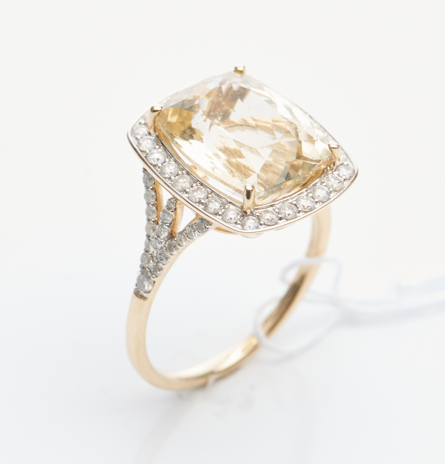A HELIODOR AND DIAMOND RING IN 14CT GOLD, FEATURING A CUSHION CUT HELIODOR OF 6.58CTS, SURROUNDED BY SIXTY TWO ROUND BRILLIANT CUT DIAMONDS, SIZE O-P, 5.5GMS