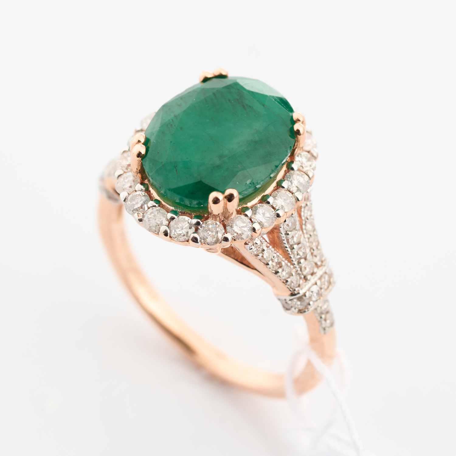AN EMERALD AND DIAMOND RING, A centrally set emerald of 3.40cts, surrounded by 64 round brilliant cut diamonds of 0.74cts in 14ct rose gold.
