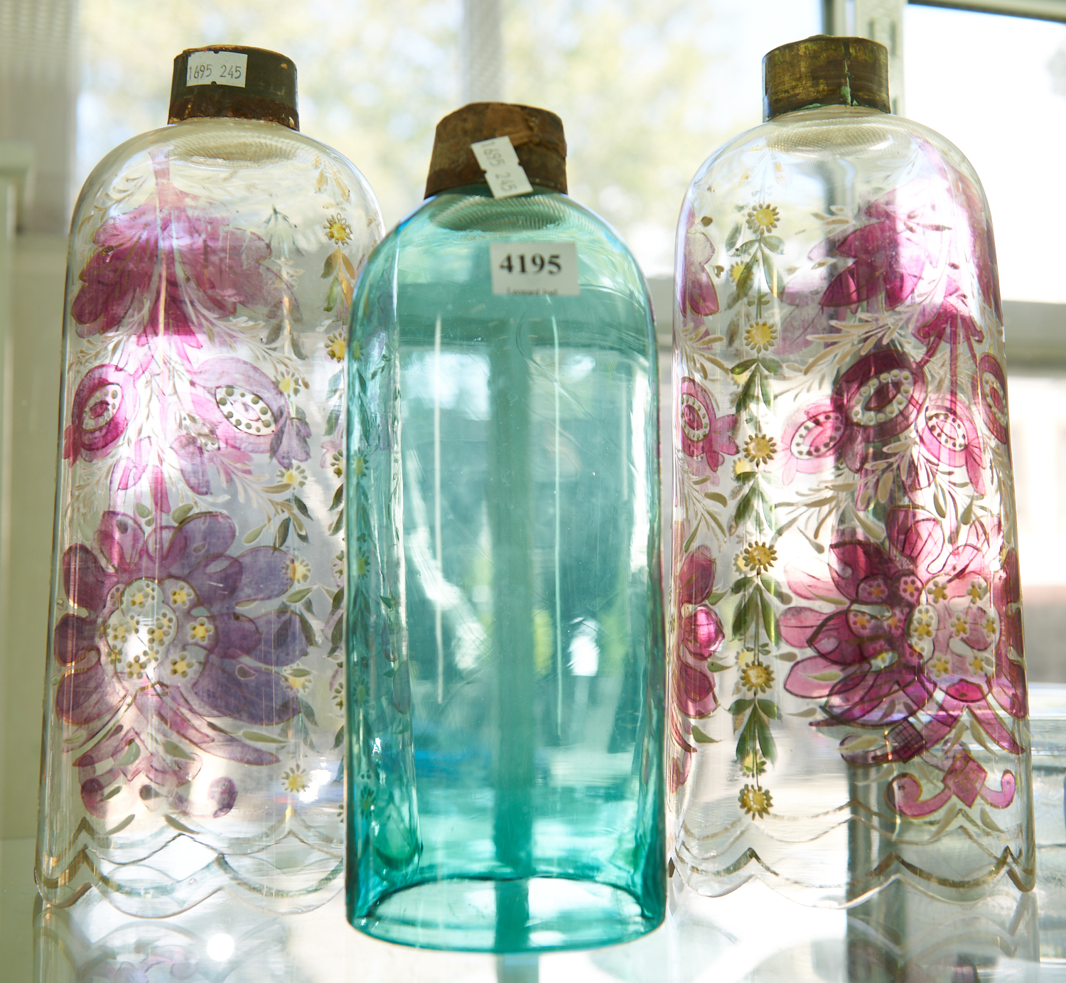 THREE ANTIQUE COLOURED AND ENAMELLED GLASS LIGHT SHADES, LEONARD JOEL LOCAL DELIVERY SIZE: SMALL