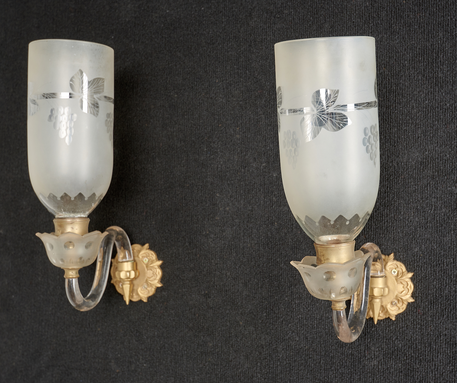 Comprising a pair each with clear glass scroll arms rising to frosted and faceted drip pans and a brass nozzle, each pair with a foliate-cast brass wall brackets and storm shades