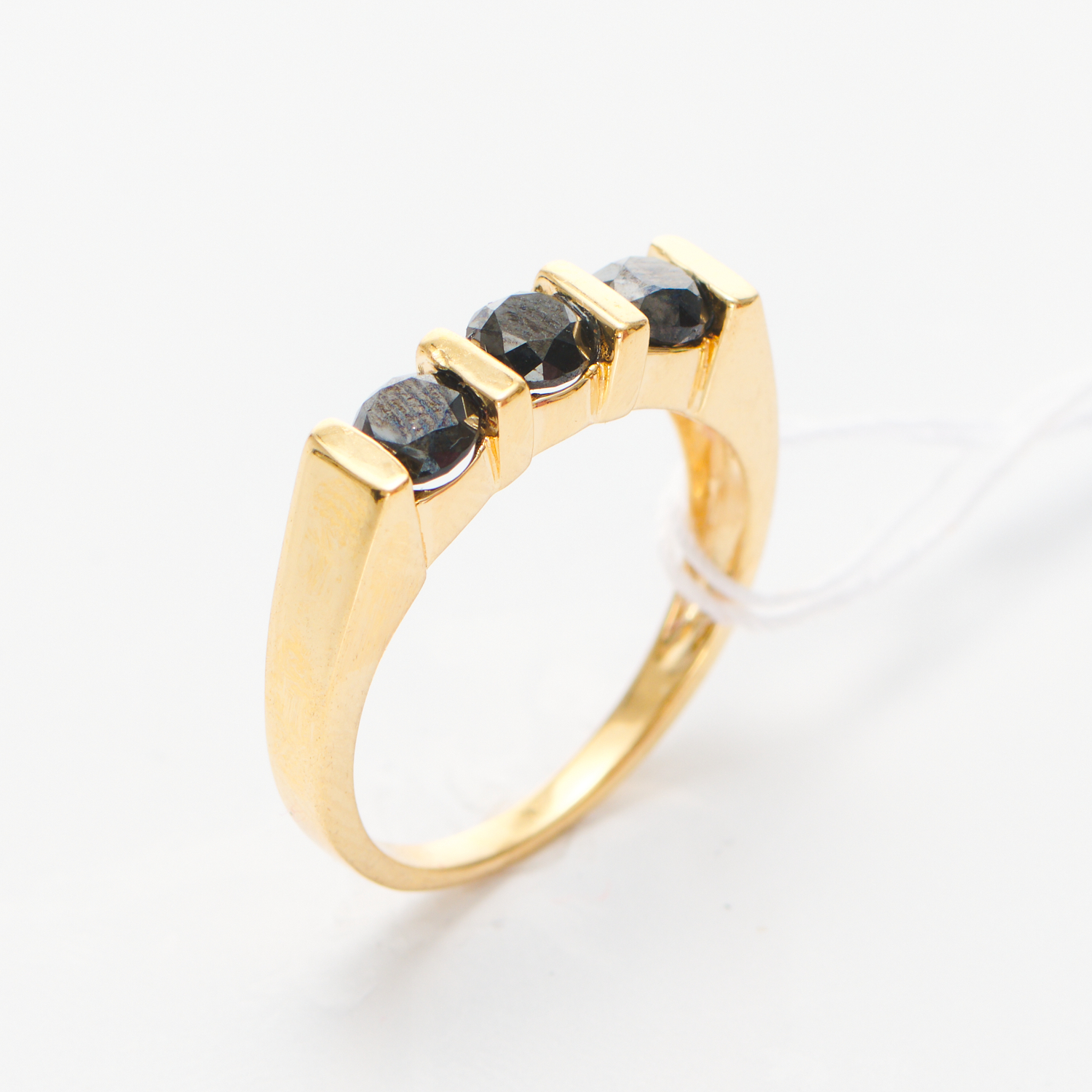 A THREE STONE BLACK DIAMOND RING IN GOLD PLATED SILVER, SIZE N