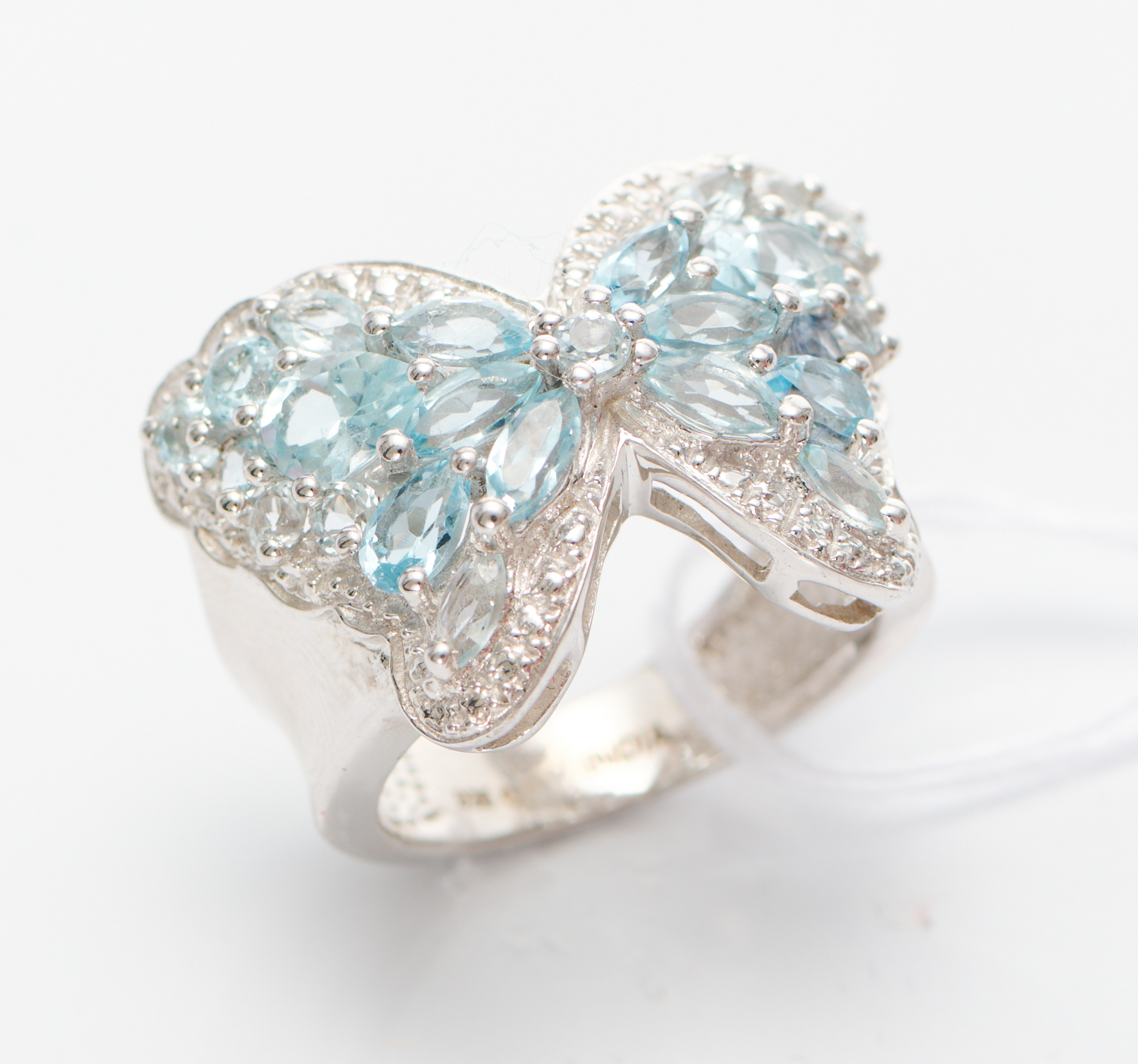 AN AQUAMARINE BUTTERFLY RING IN SILVER, SIZE N