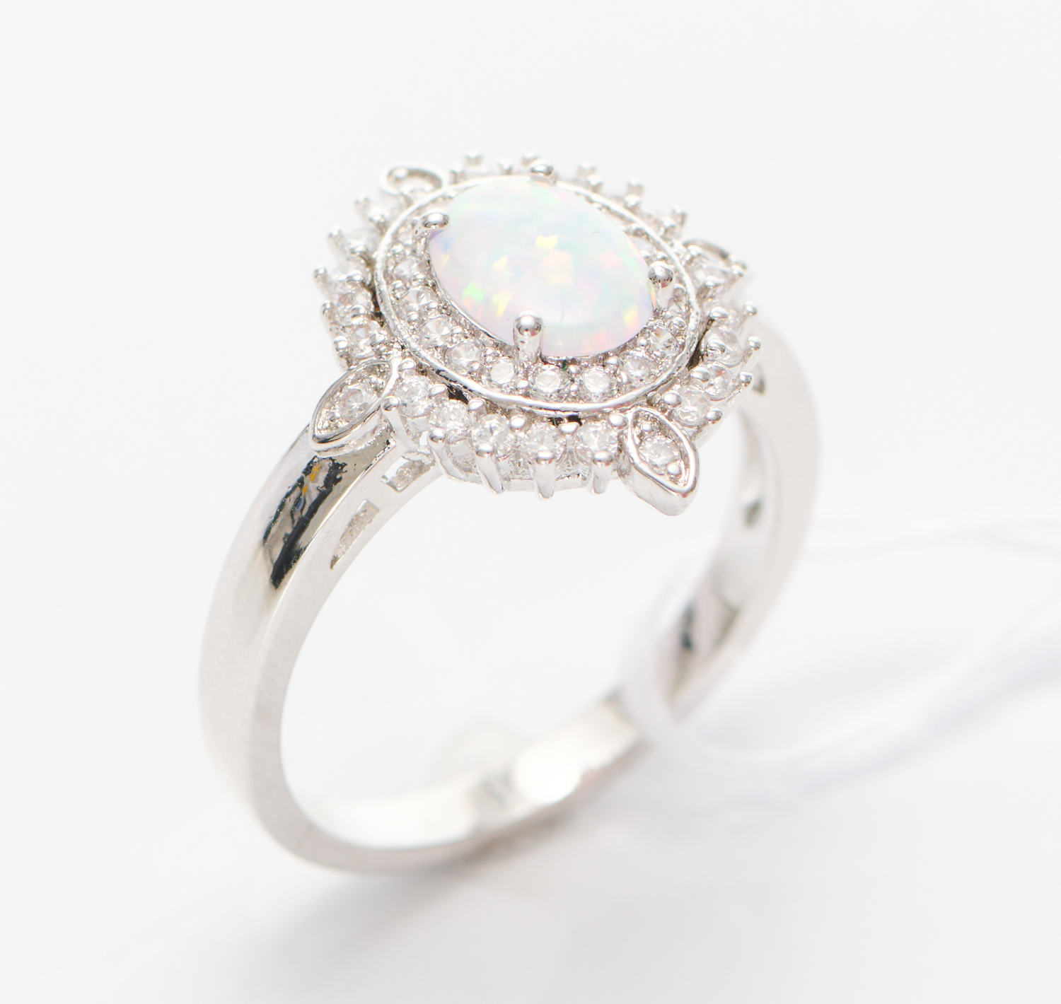 A SYNTHETIC OPAL AND DIAMOND RING IN SILVER, SIZE P