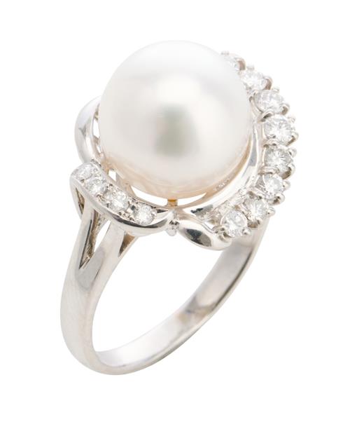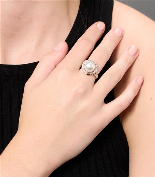 The ring presents in excellent, as new condition with all stones intact and secure in setting. Pearl has an excellent lustre and blemish free skin.