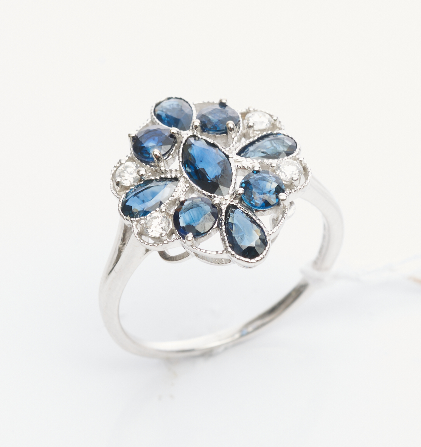 A SAPPHIRE AND DIAMOND FLORAL RING IN 14CT WHITE GOLD, COMPRISING MARQUISE CUT AND ROUND CUT BLUE SAPPHIRES SURROUNDED BY FOUR ROUND BRILLIANT CUT DIAMONDS, SIZE O, 3.3GMS