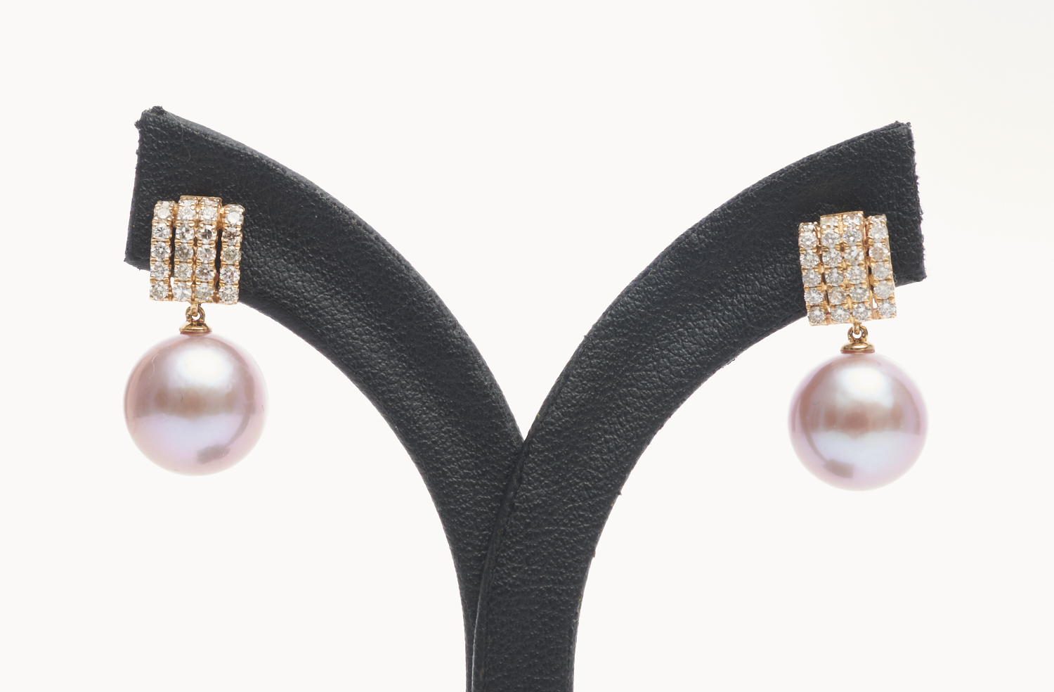 A PAIR OF DIAMOND AND CULTURED PEARL EARRINGS IN 14CT GOLD, THE ROUND LAVENDER PEARL MEASURING 10.5MM, SUSPENDED FROM A RECTANGULAR PLAQUE SET WITH FORTY-EIGHT ROUND BRILLIANT CUT DIAMONDS ESTIMATED 0.53CT, TO POST FITTINGS, LENGTH 20MM