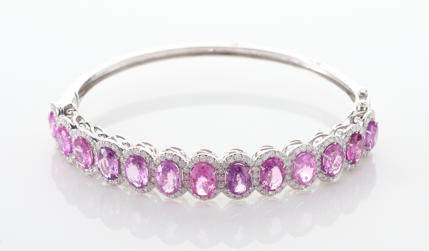 A PINK SAPPHIRE AND DIAMOND BANGLE - Set with 13 oval cut pink sapphires of approximately 12.59cts, with diamonds totalling approximately 2.17cts, in 18ct white gold.