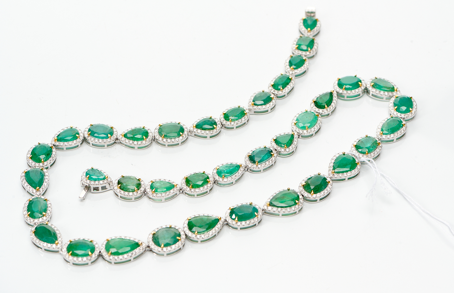 Featuring thirty six oval and pear cut emeralds totalling an estimated 72.58cts and round brilliant cut diamonds totalling an estimated 11.44cts, in platinum, total length 5350mm.