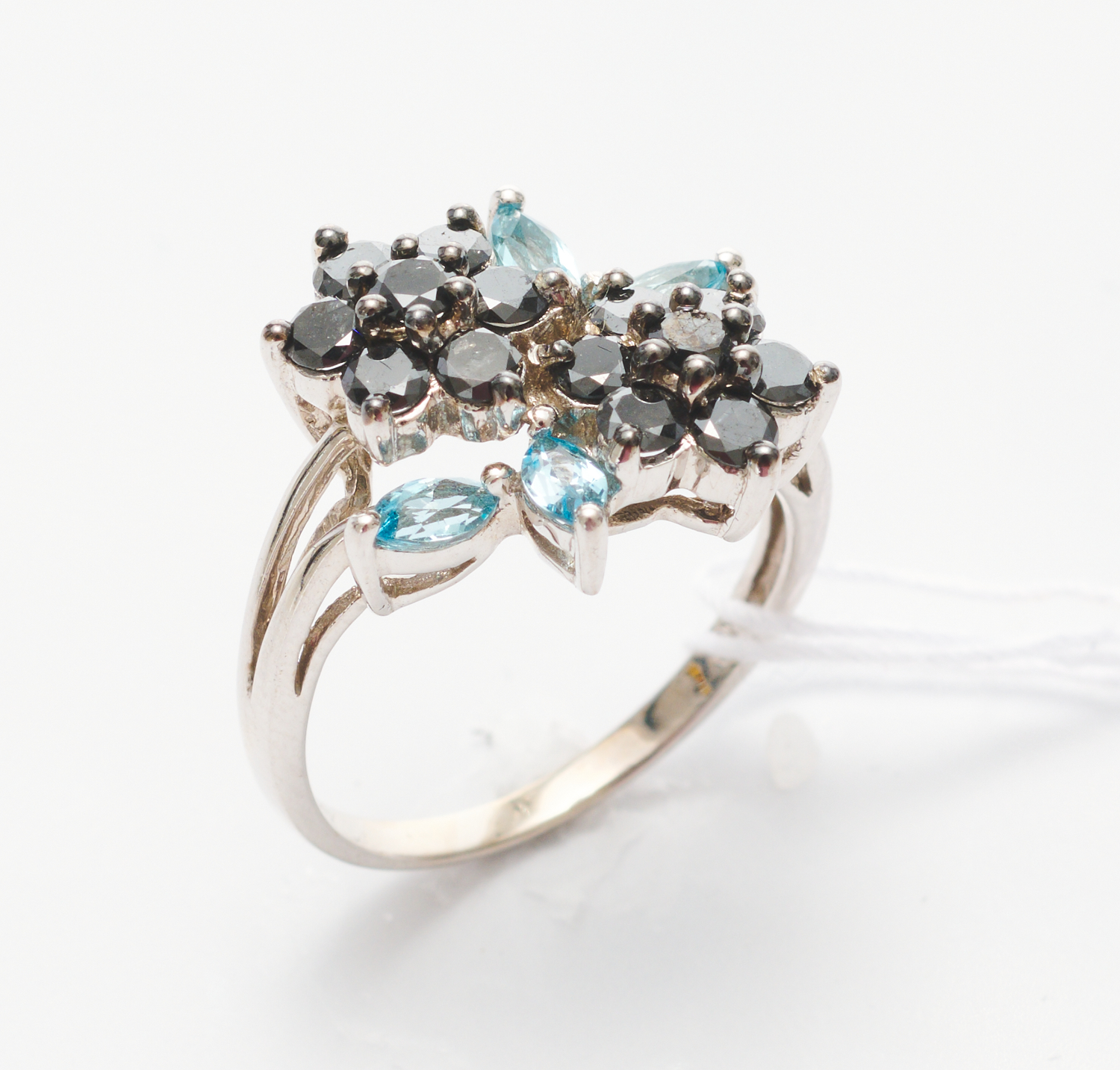 A BLACK DIAMOND AND BLUE TOPAZ RING IN 9CT WHITE GOLD, SIZE N, 3.7GMS