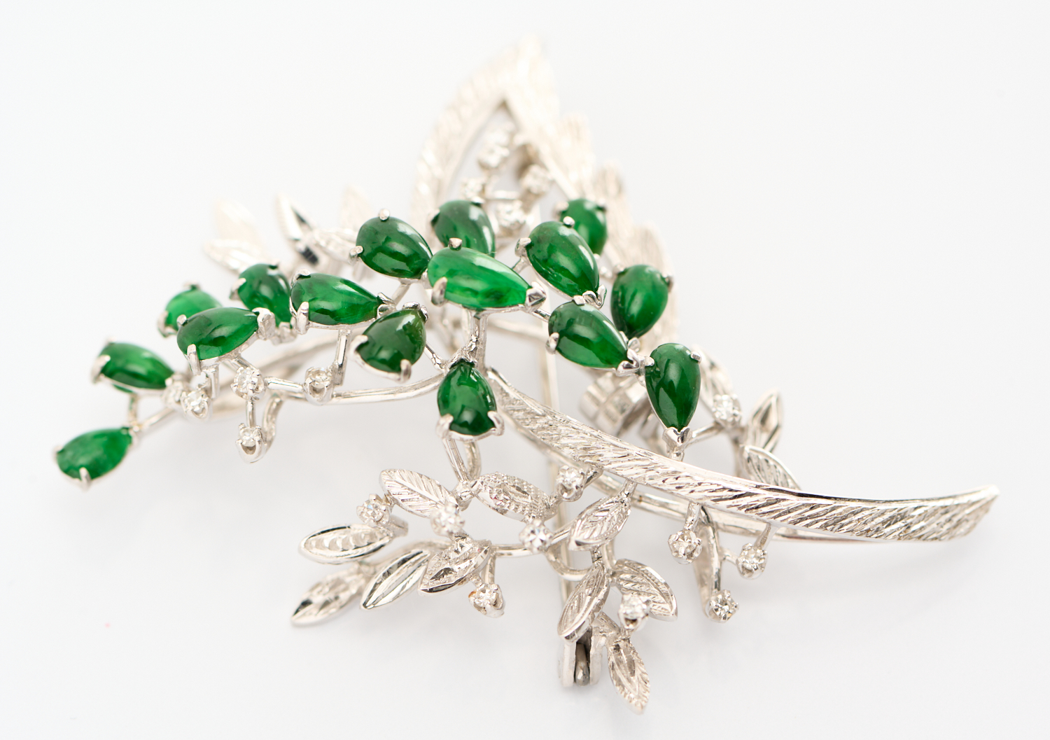 A JADEITE AND DIAMOND BROOCH IN LOW CT WHITE GOLD, 50MM, 14.3GMS