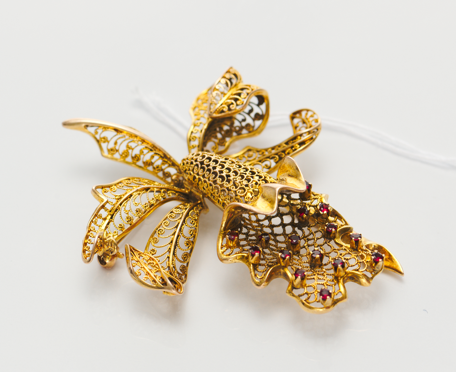A GARNET BROOCH STAMPED IN 9CT GOLD, 11.7GMS