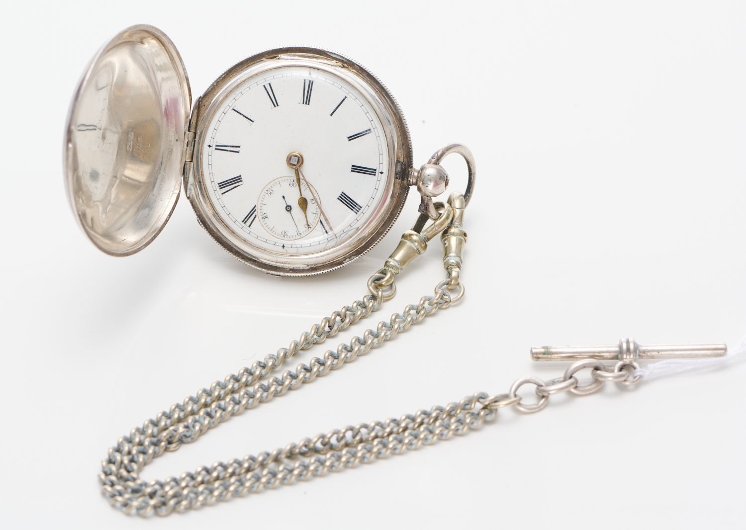 A POCKET WATCH WITH A STERLING SILVER FOB AND CHAIN