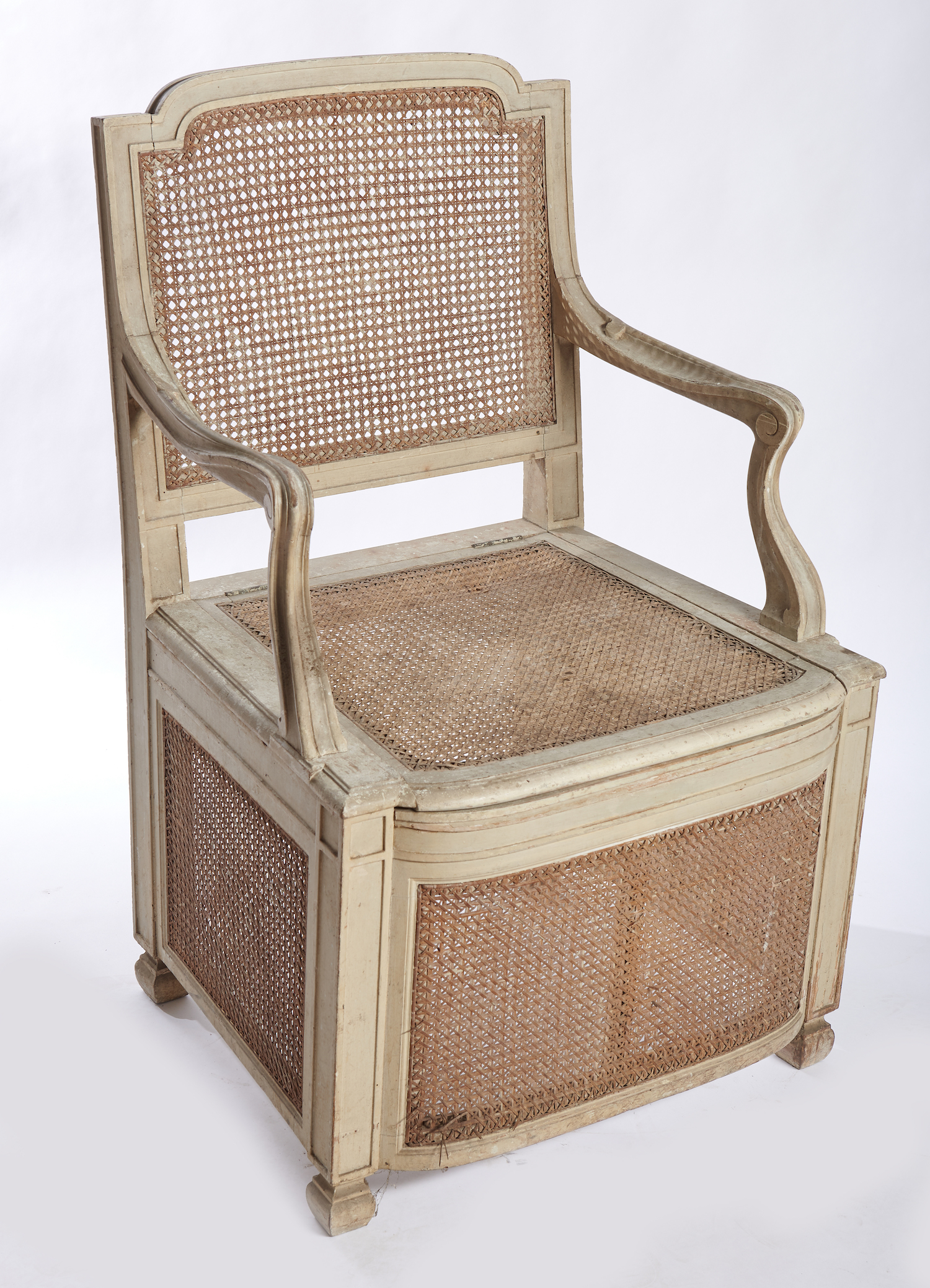In reasonably good condition relative to age and use. The frame (which is beech, not oak as catalogued) is structurally sound but superficially worn and dirty, the paintwork being more lightly and evenly worn to the frame but largely lost on the caning; the caned panels remain tight and free of damage, excepting a couple of spots of damage to the seat and front panel; there are some old worm holes and other small holes around the frame; the fittings beneath the seat have previously been removed.