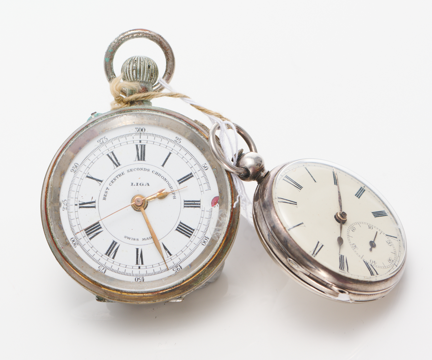 A SILVER REWIND POCKET WATCH WITH A SILVER PLATED "LIGA"