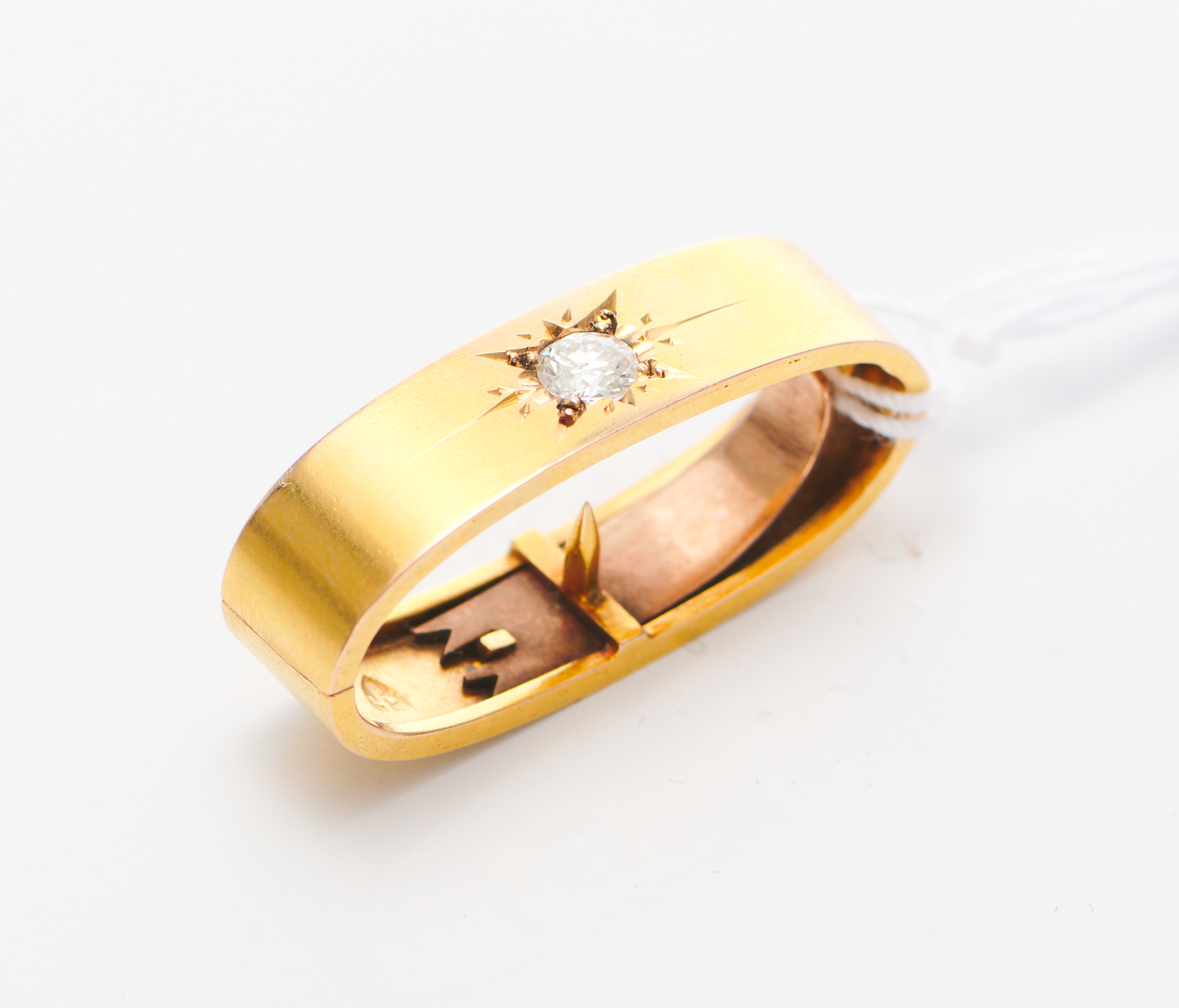 AN ANTIQUE SCARF RING IN 15CT GOLD FEATURING A DIAMOND ESTIMATED 0.20CT, 4.7GMS