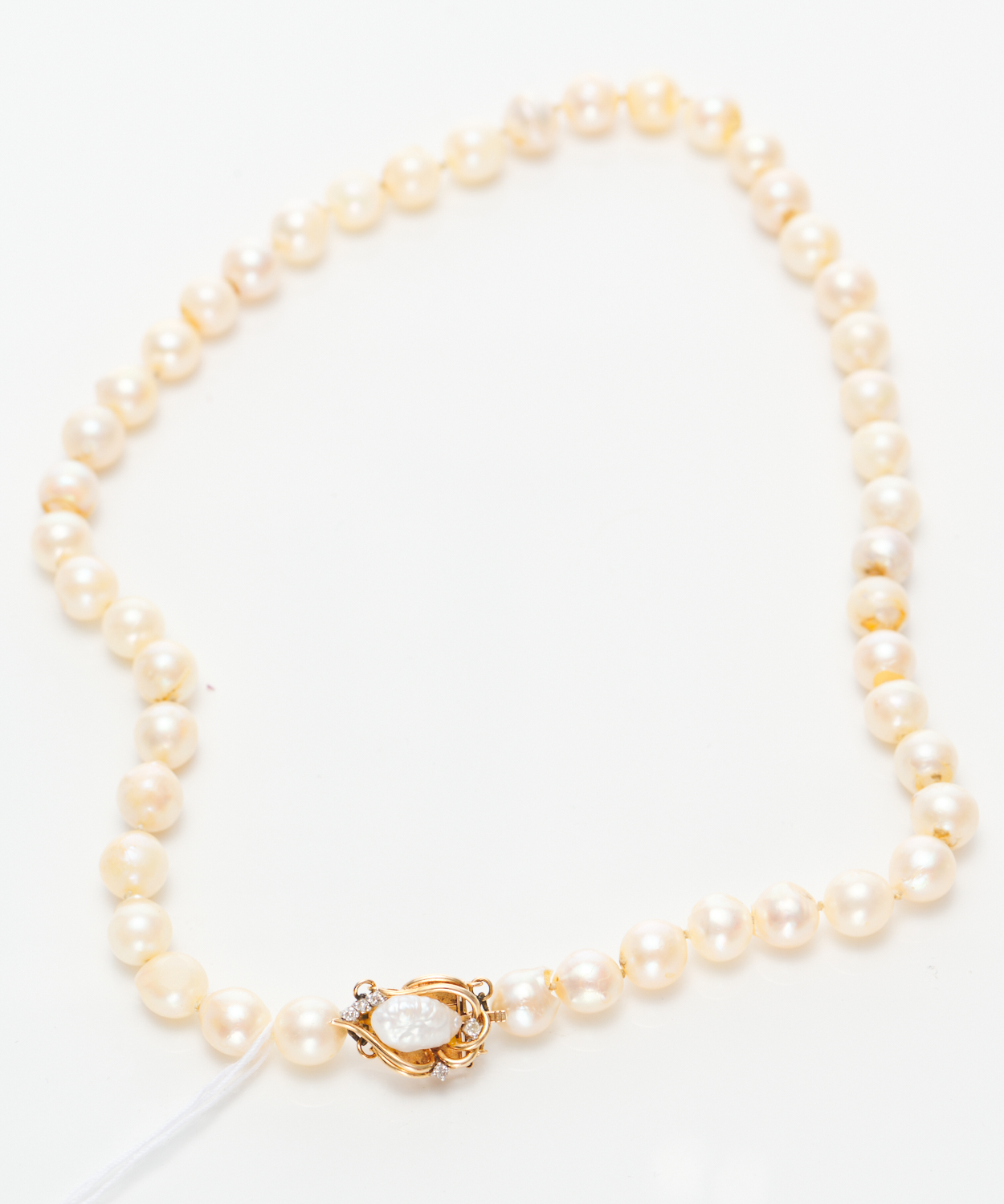 A STRAND OF CULTURED PEARLS MEASURING 8.00MM, TO A 14CT GOLD FRESH WATER PEARL AND DIAMOND CLASP, LENGTH 46CMS