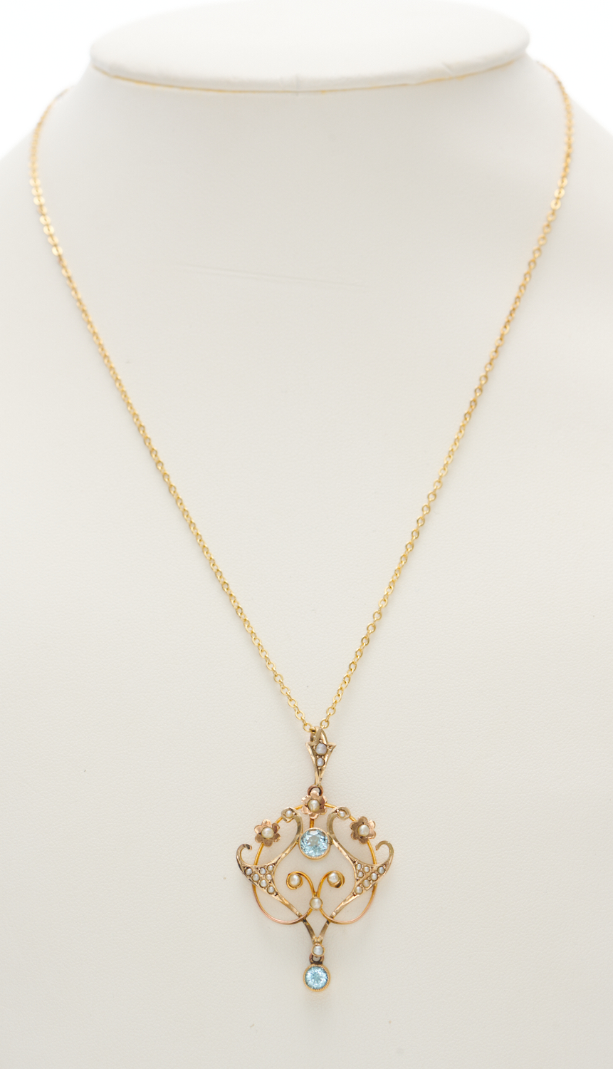 AN EDWARDIAN AQUAMARINE AND SEED PEARL PENDANT IN 9CT GOLD, LENGTH OF THE PENDANT 45MM, 3.2GMS (TO A DISPLAY CHAIN)