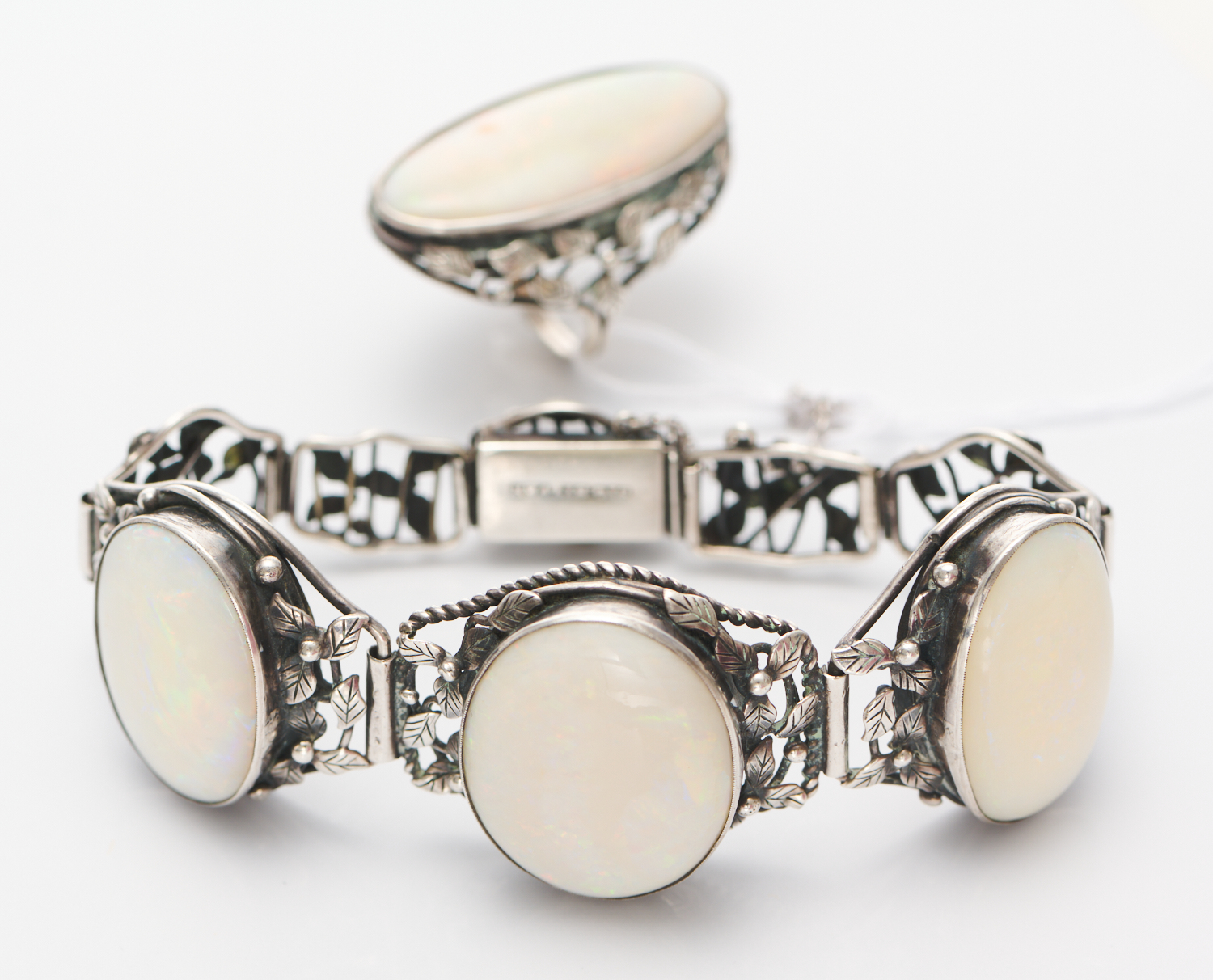 AN OPAL BRACELET AND RING SUITE IN SILVER IN THE MANNER OF RHODA WAGGER