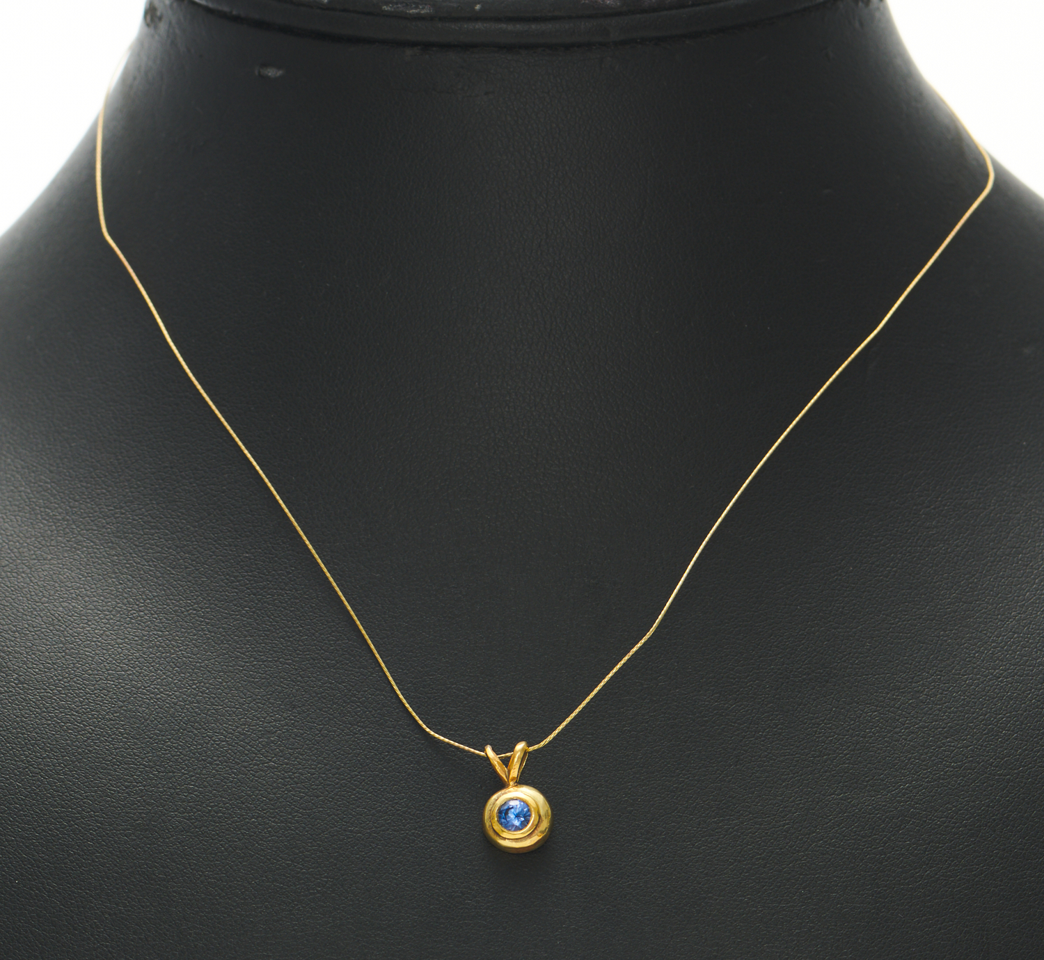 A SAPPHIRE PENDANT WITH CHAIN IN 9CT GOLD, 2.2GMS, A/F