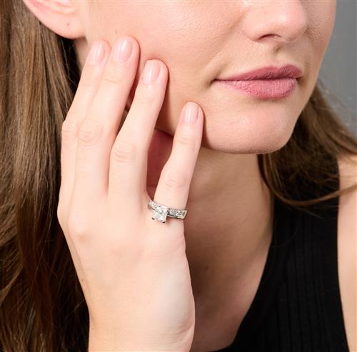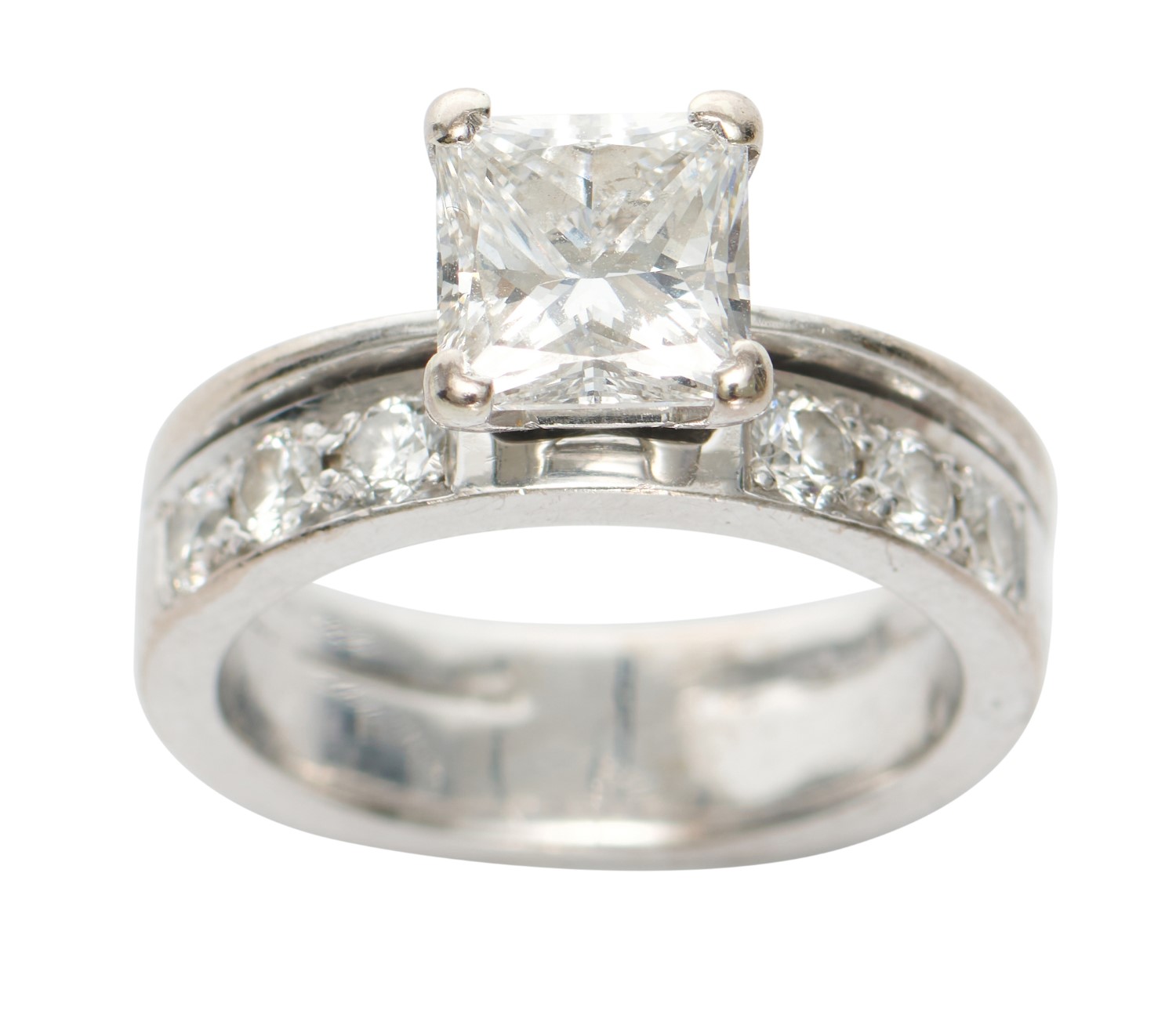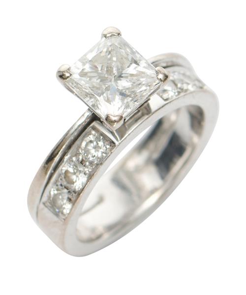 The ring presents in very good condition overall with all stones secure in setting. Originally engagement and fitted wedding band fused into one ring. Some evidence of wear to gold surfaces.