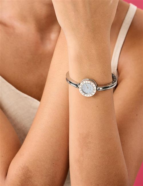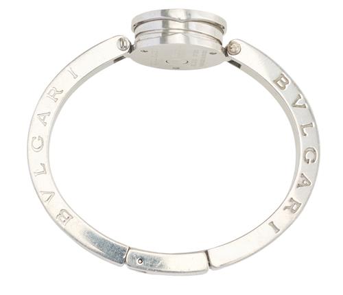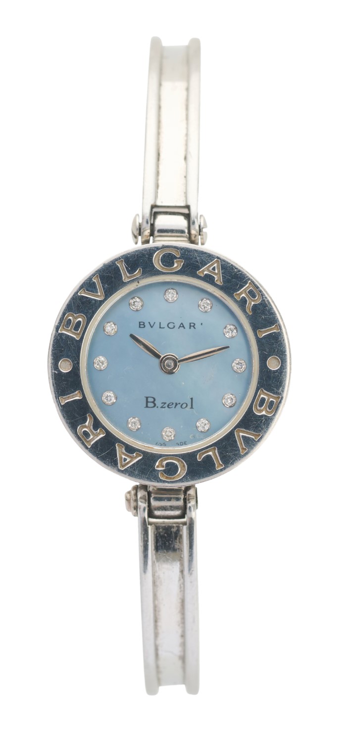 A WRISTWATCH BY BVLGARI - From the 'B.Zero 1' range, quartz movement, circular mother of pearl dial set with round brilliant cut diamonds, signed case, dial and movement, stainless steel case and conforming bracelet bands, total length 160mm, diameter 22mm.