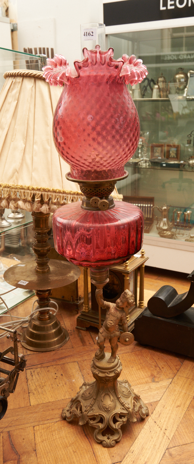 A VICTORIAN BANQUET LAMP WITH RUBY GLASS SHADE AND FIGURAL BASE H.79CM, LEONARD JOEL LOCAL DELIVERY SIZE: SMALL