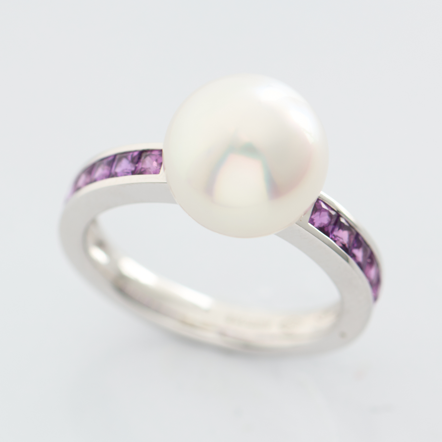 A PEARL AND PURPLE SAPPHIRE RING BY AUTORE-FEATURING A ROUND PEARL OF WHITE HUES MEASURING 10MM, FLANKED BY PRINCESS CUT PURPLE SAPPHIRES TOTALLING 0.92CTS, SIGNED, IN 18CT WHITE GOLD, RING SIZE N, 5.8GMS