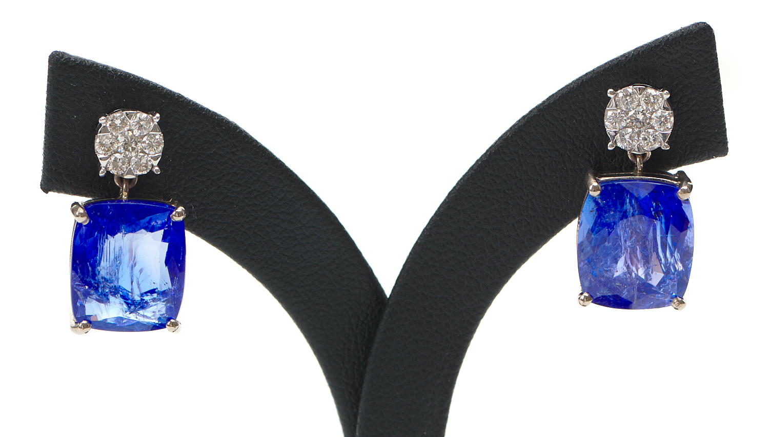 A PAIR OF TANZANITE AND DIAMOND EARRINGS IN 18CT WHITE GOLD