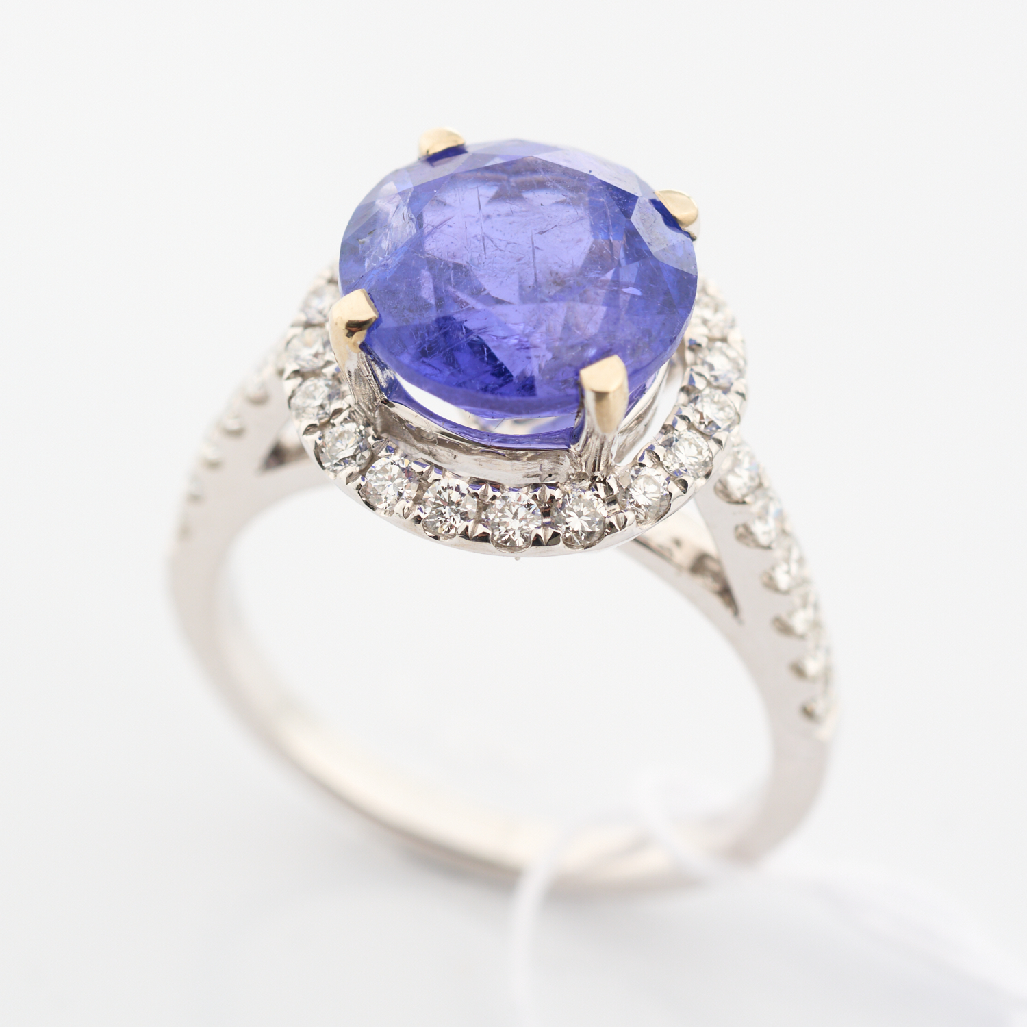 A TANZANITE AND DIAMOND RING, CENTRALLY SET WITH A ROUND TANZANITE WITHIN A DIAMOND SURROUND AND DIAMOND SET SHOULDERS TOTALLING 0.53CTS, IN 18CT WHITE GOLD, RING SIZE M, 5.7GMS