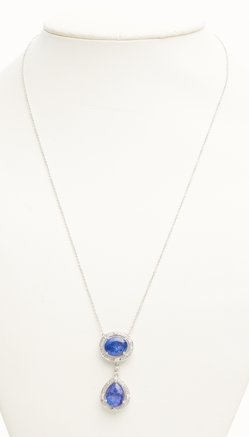 A TANZANITE AND DIAMOND DROP NECKLACE IN 18CT WHITE GOLD, COMPRISING A PEAR CUT AND ROUND CUT TANZANITE TOTALLING 8.16CTS, WITH DIAMOND SURROUND TOTALLING 0.50CT, TO A FINE TRACE CHAIN, LENGTH 51CMS, 6.9GMS