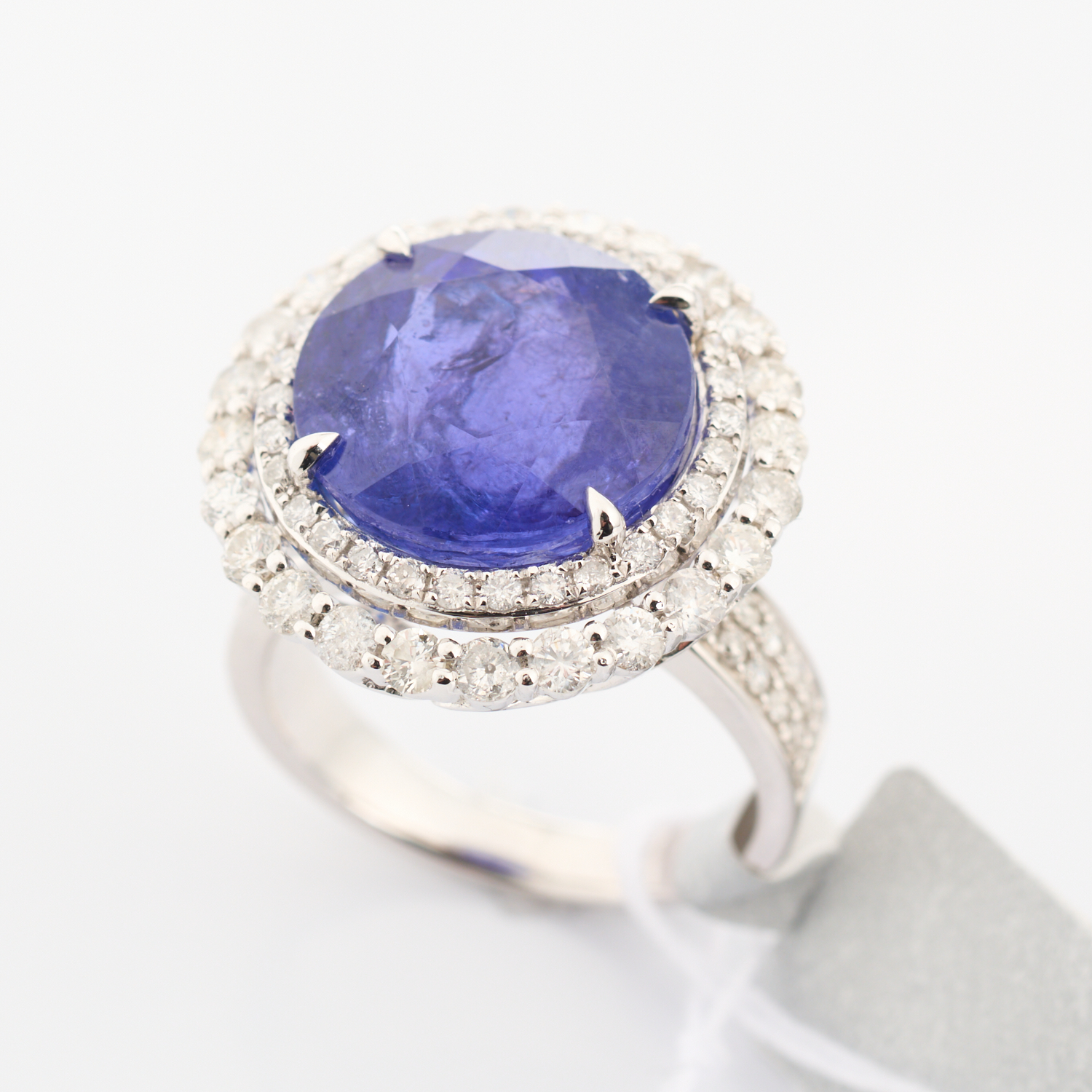 A TANZANITE AND DIAMOND RING IN 18CT WHITE GOLD, FEATURING A ROUND CUT TANZANITE WEIGHING 10.14CTS, WITHIN A DIAMOND SURROUND TOTALLING 1.33CTS, 9.30GMS