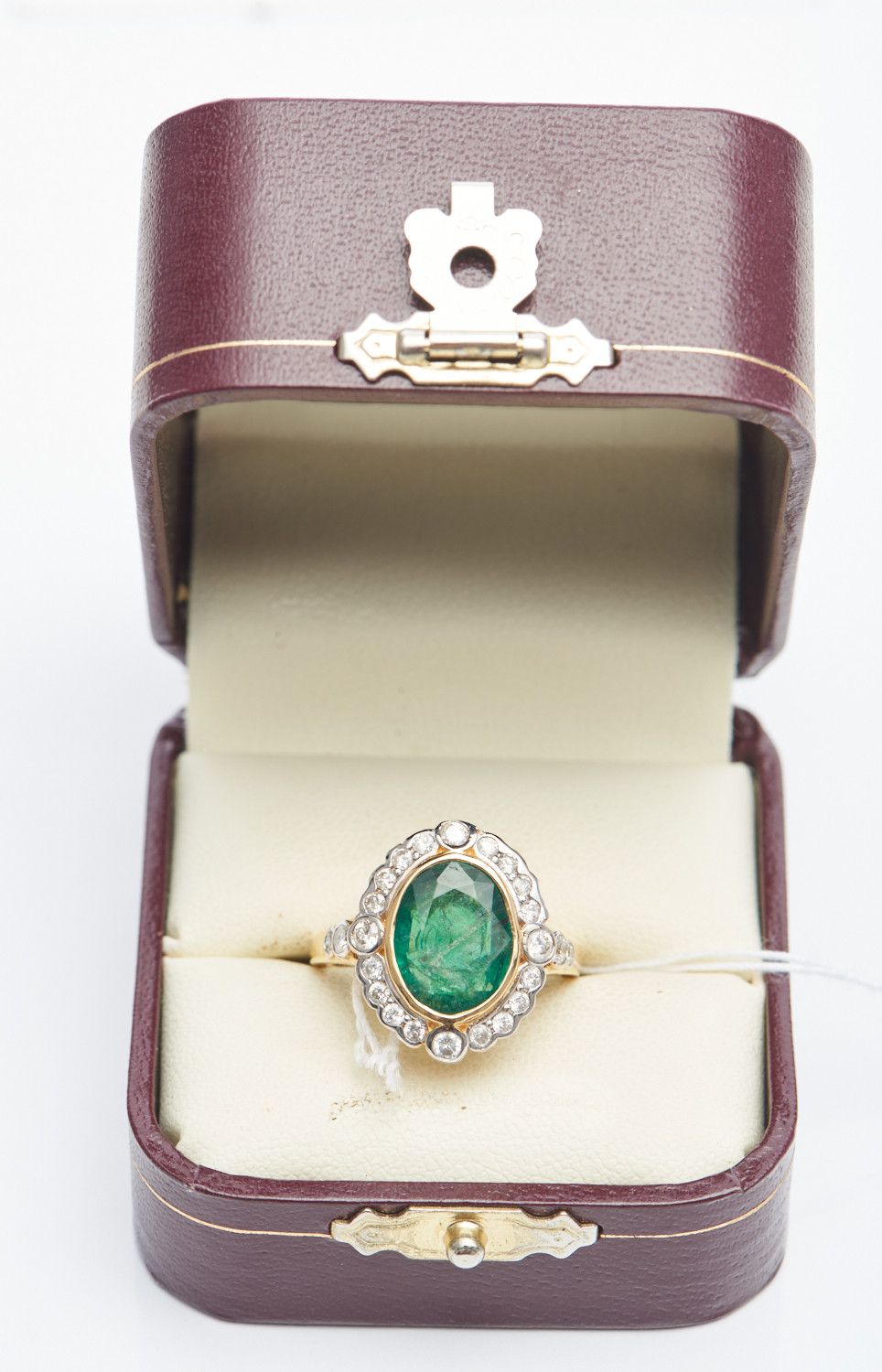 AN ART DECO INSPIRED RING IN 18CT WHITE GOLD, COMPRISING AN EMERALD CUT COLOMBIAN EMERALD WEIGHING 11.32CTS, WITHIN A SURROUND OF RO...