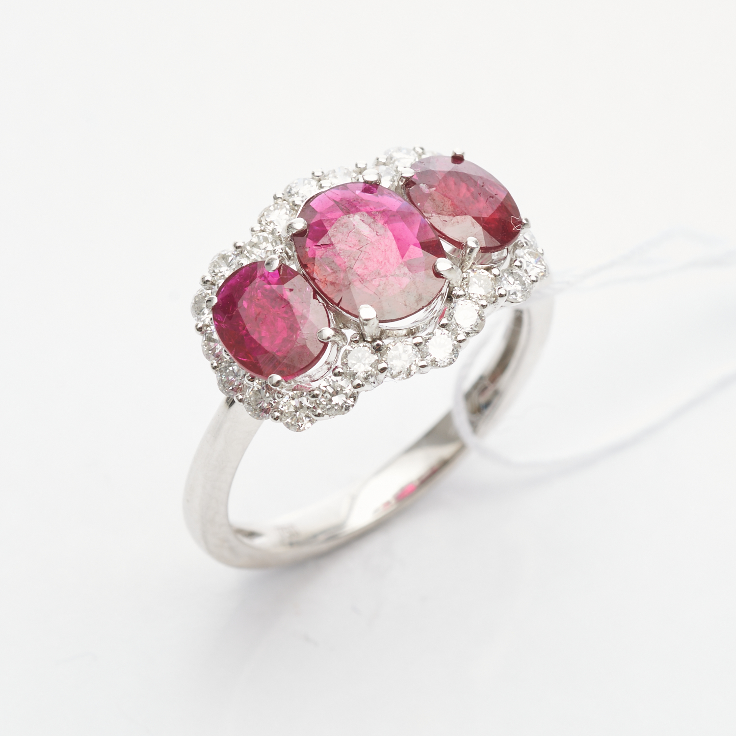 AN UNHEATED BURMESE SAPPHIRE AND DIAMOND RING IN 18CT WHITE GOLD, COMPRISING THREE RECTANGULAR CUT BLUE SAPPHIRES TOTALLING 3.28CTS,...