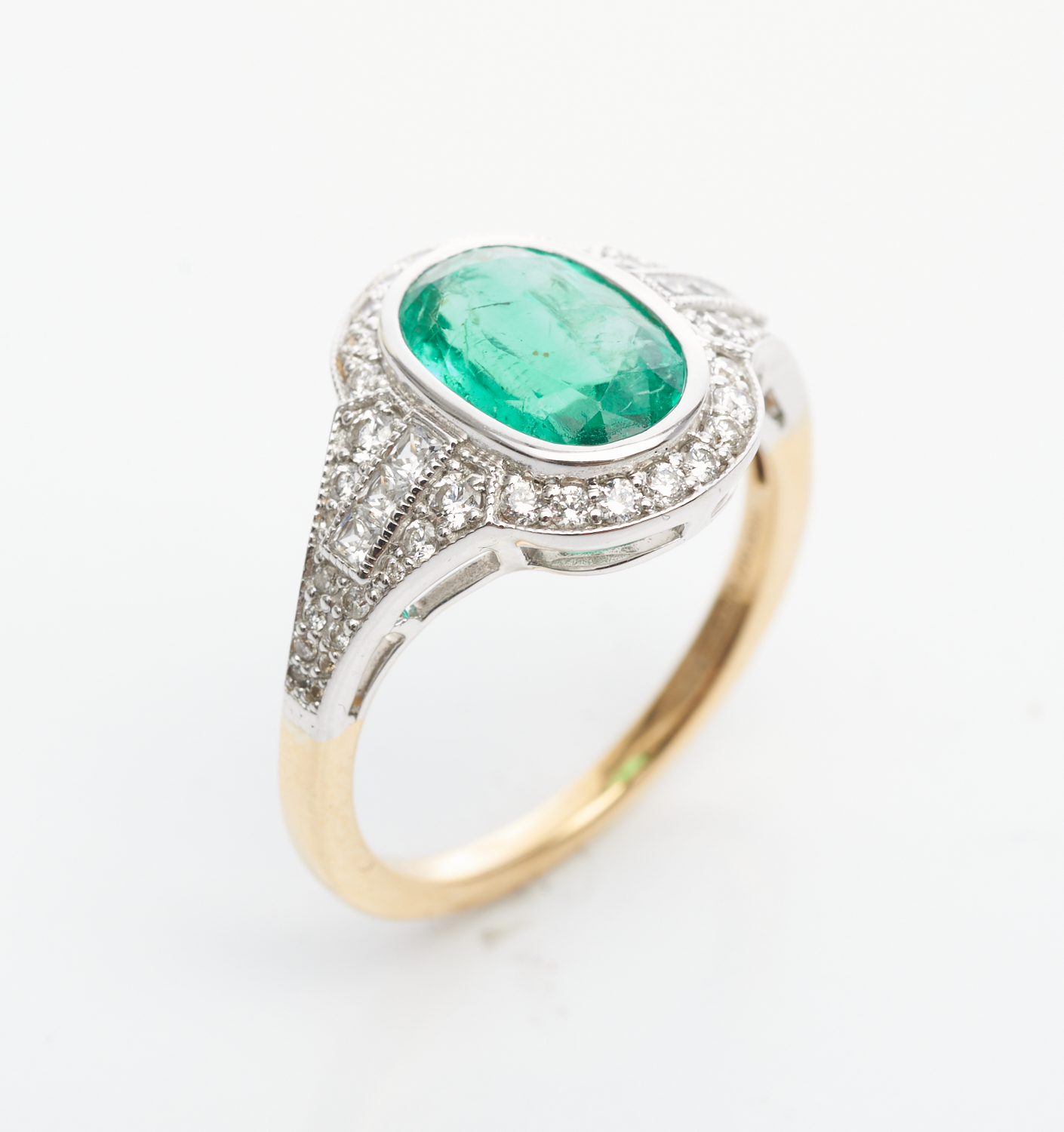 AN ART DECO STYLE EMERALD AND DIAMOND RING IN 18CT WHITE GOLD, FEATURING AN OVAL CUT EMERALD OF 2.03CTS, WITHIN A SURROUND OF DIAMOND, SIZE N, 5.1GMS