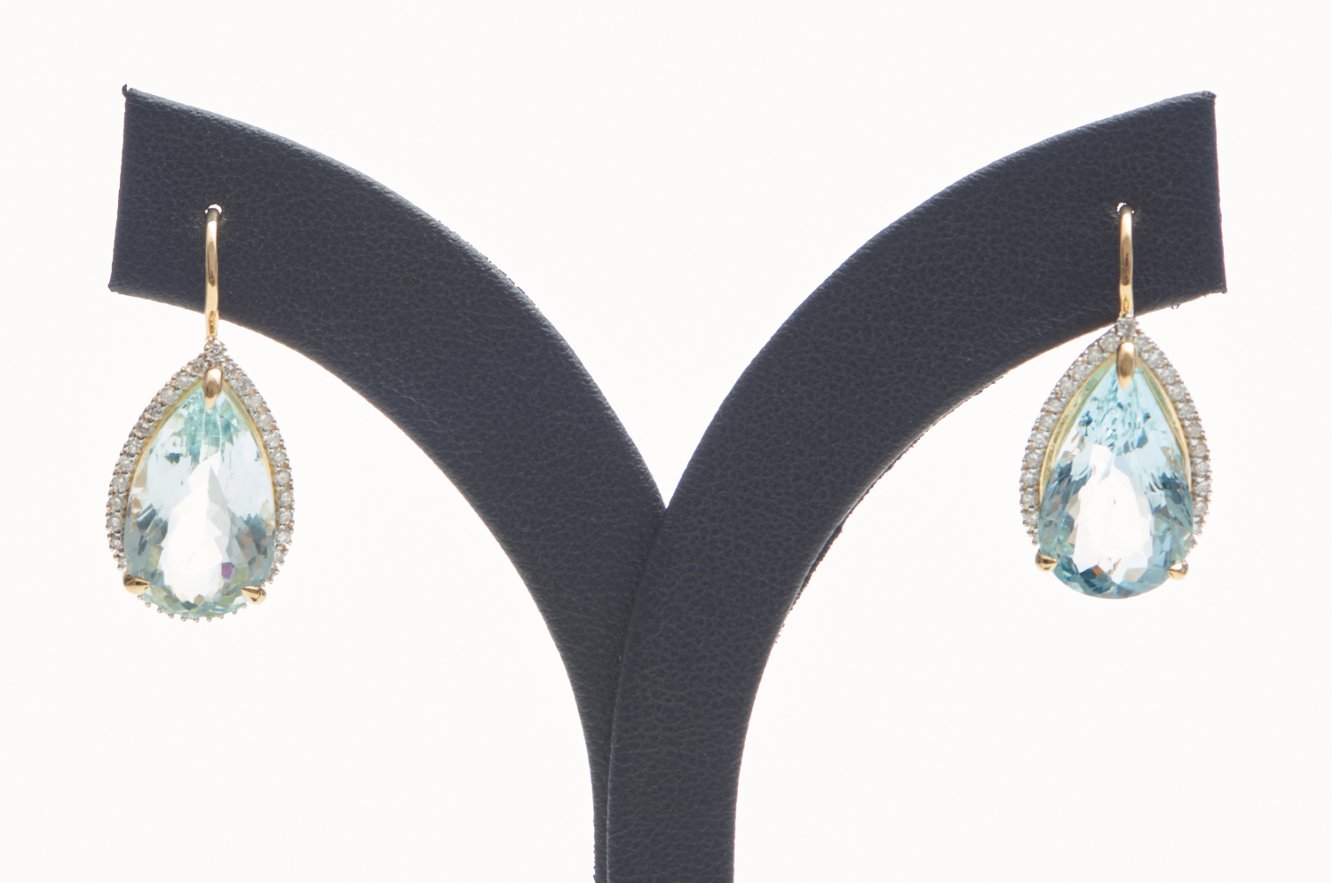 A PAIR OF AQUAMARINE AND DIAMOND EARRINGS IN 18CT GOLD, FEATURING PEAR CUT AQUAMARINES TOTALLING 12.48CTS WITHIN A SURROUND OF ROUND BRILLIANT CUT DIAMONDS TOTALLING 0.53CT, TO SHEPHERD HOOK FITTINGS, LENGTH 25MM, 8.20GMS