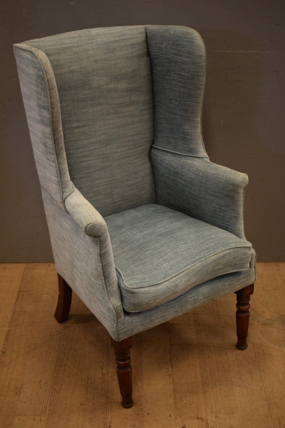 A CONTEMPORARY EFFECT WINGBACK ARMCHAIR WITH BLUE FABRIC UPHOLSTERY (REPAIR TO LEG) (112H X 64W X 67D CM) (LEONARD JOEL DELIVERY SIZE: LARGE)