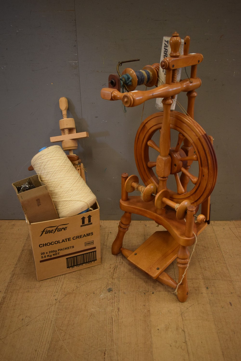 A TIMBER SPINNING WHEEL WITH EXTRAS (87 CM H) (LEONARD JOEL DELIVERY SIZE: MEDIUM)