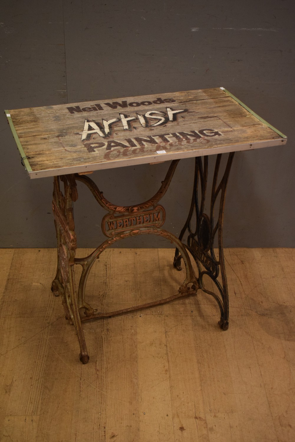 A RUSTIC TABLE WITH CAST IRON SEWING MACHINE BASE (78H x 81W x 48D CM) (PLEASE NOTE THIS HEAVY ITEM MUST BE REMOVED BY CARRIERS AT THE CUSTOMER'S EXPENSE. LEONARD JOEL STAFF CANNOT ASSIST CARRYING THIS ITEM) (X-LARGE ITEM)