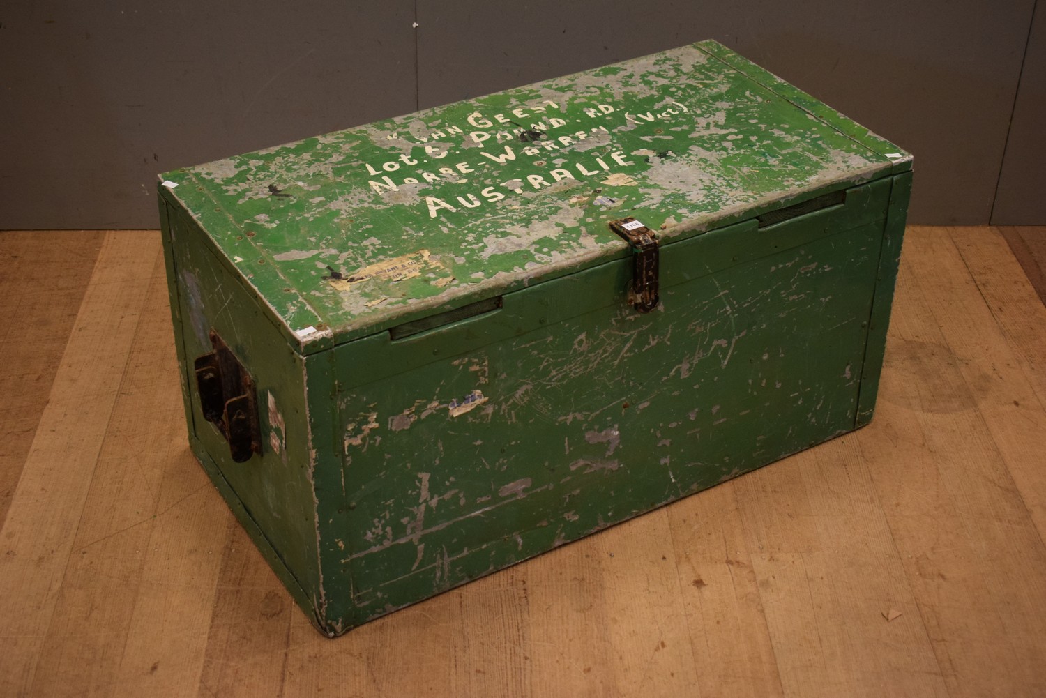 A LARGE RUSTIC TIMBER TRUNK WITH METAL EXTERIOR (47H x 95W x 49D CM) (LEONARD JOEL DELIVERY SIZE: LARGE)