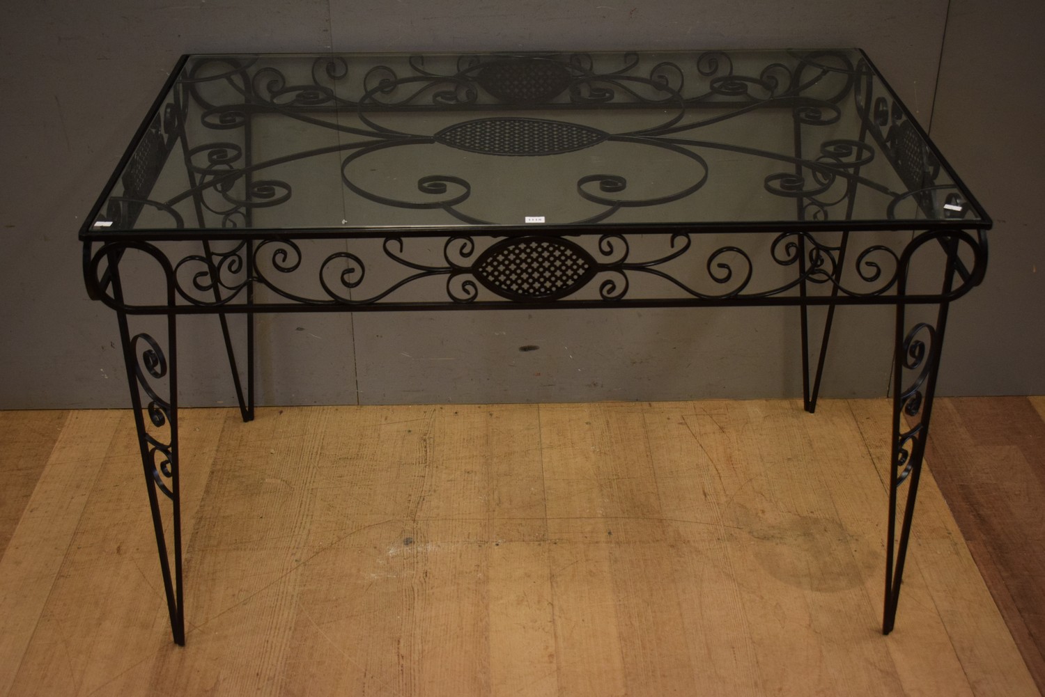A METAL OUTDOOR TABLE WITH GLASS TOP (76H x 122W x 74D CM) (PLEASE NOTE THIS HEAVY ITEM MUST BE REMOVED BY CARRIERS AT THE CUSTOMER'S EXPENSE. LEONARD JOEL STAFF CANNOT ASSIST CARRYING THIS ITEM) (X-LARGE ITEM)