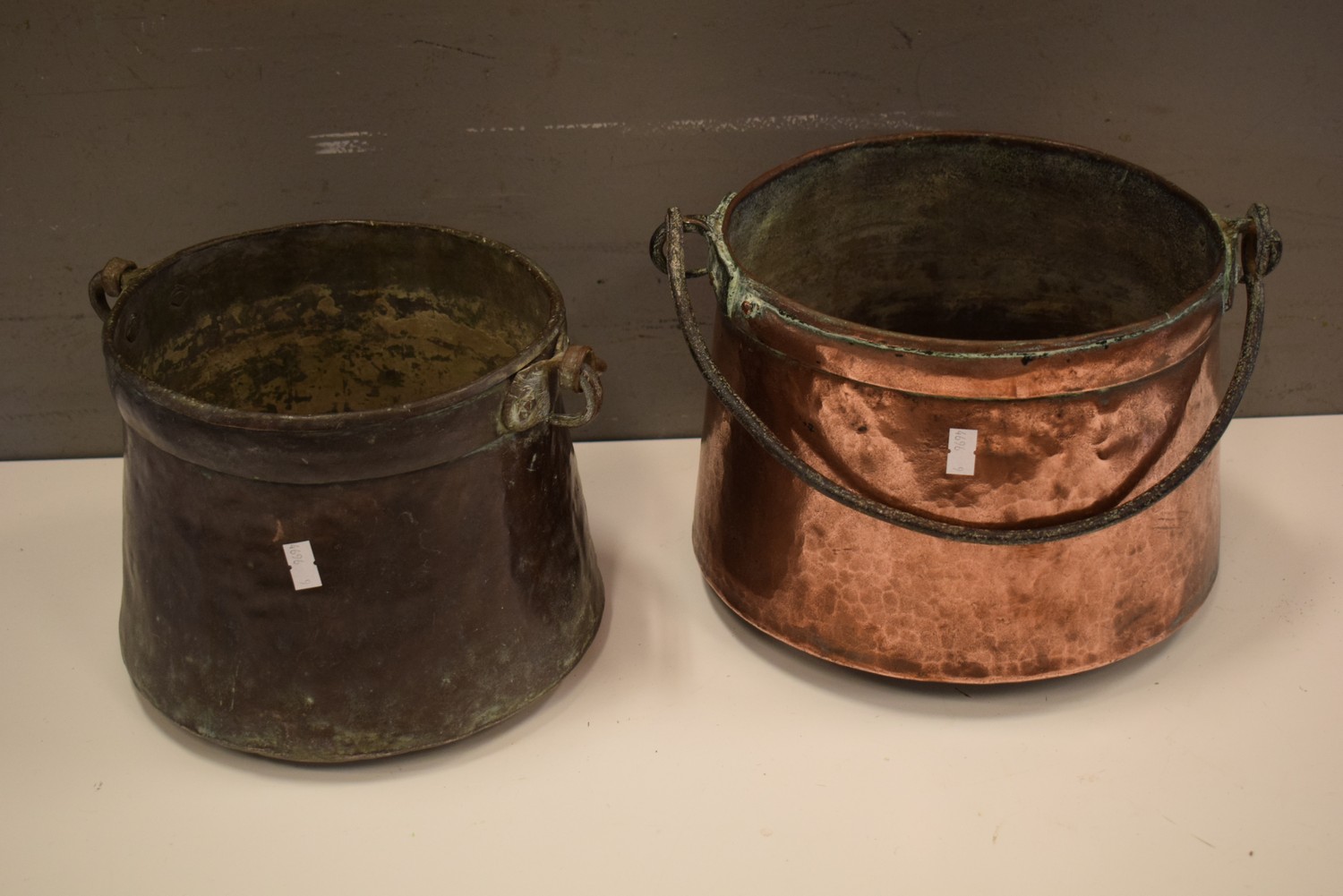 TWO FRENCH COPPER CAULDRONS (32 CM D) (LEONARD JOEL DELIVERY SIZE: SMALL)