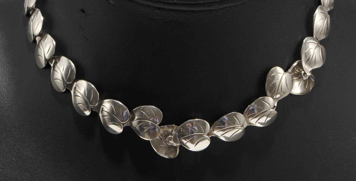 A SCANDINAVIAN NECKLACE IN SILVER FEATURING LEAF DESIGN, UNSIGNED, LENGTH 40CM STAMPED 8305