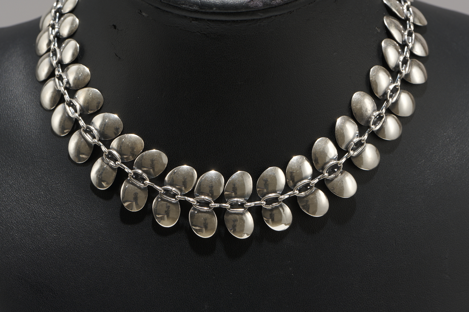 A SCANDINAVIAN CHAIN LINK NECKLACE IN SILVER FEATURING LEAF DESIGN WITH TOGGLE CLOSURE, TOTAL LENGTH 40CM, STAMPED 6058