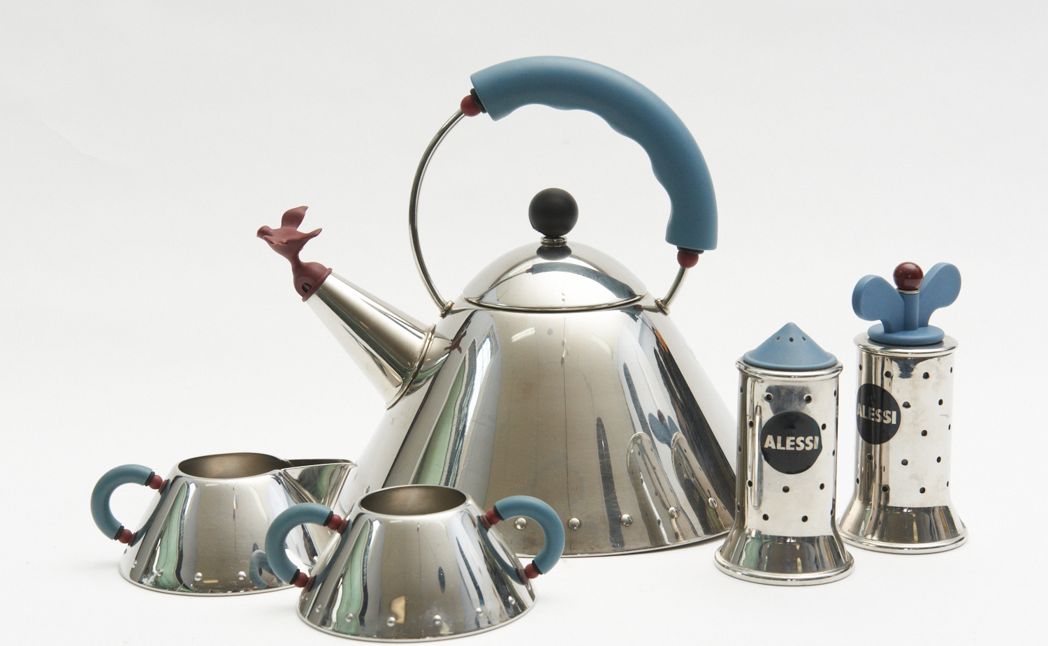 AN ALESSI KETTLE, CREAMER, SUGAR BOWL, SALT SHAKER AND PEPPER GRINDER BY MICHAEL GRAVES, LEONARD JOEL LOCAL DELIVERY SIZE: SMALL