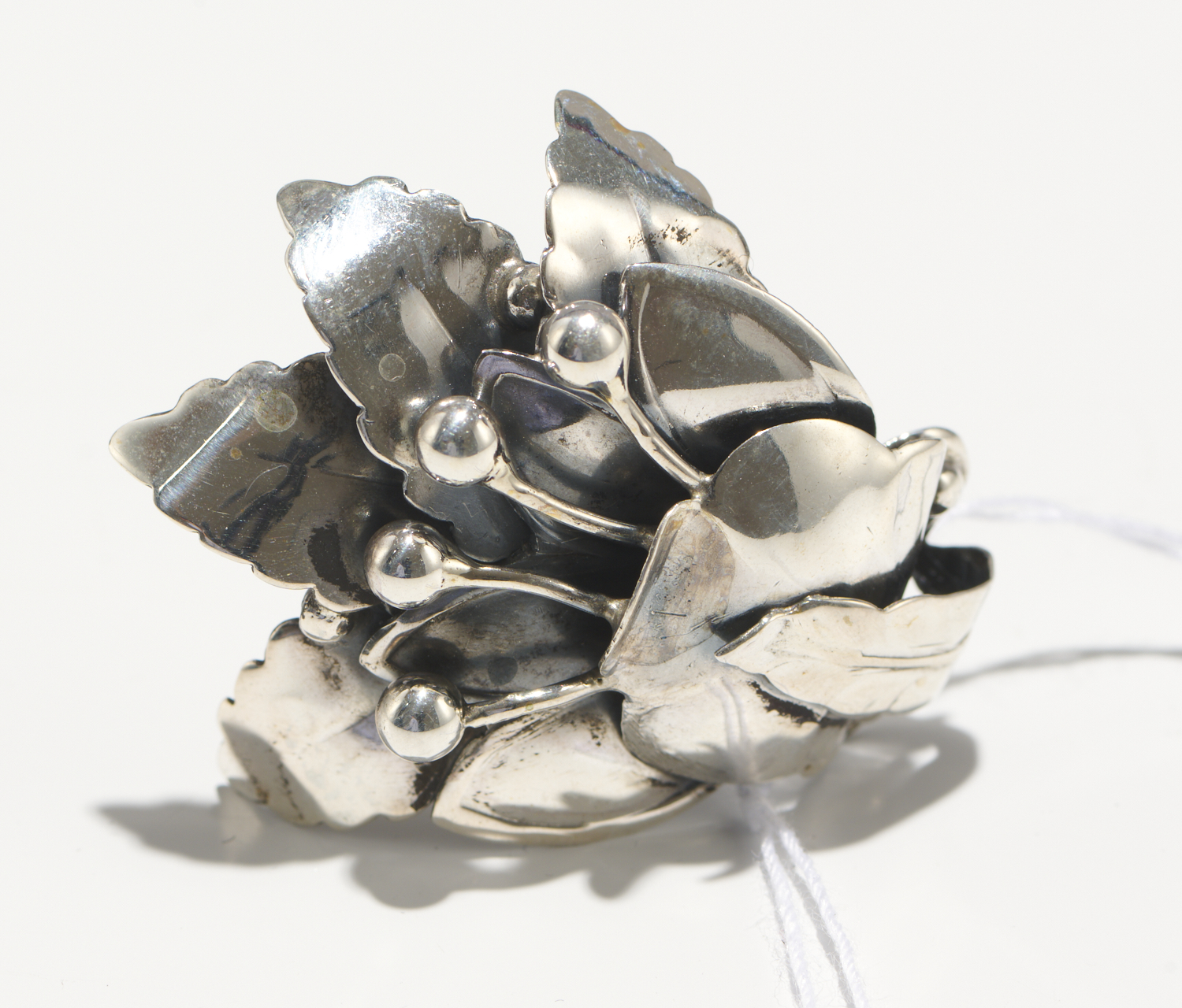 A SCANDINAVIAN FLORAL BROOCH IN SILVER WITH ROLL OVER PIN CLOSURE, STAMPED CDF 8305, TOTAL LENGTH 4CM