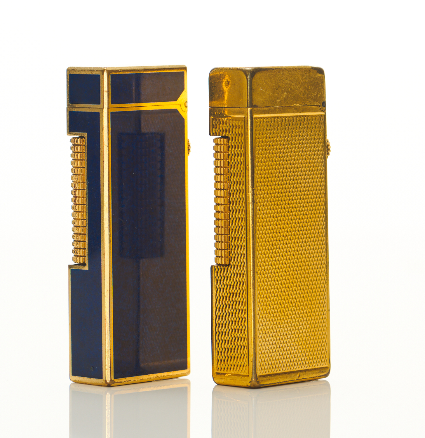 TWO VINTAGE LIGHTERS BY DUNHILL, ONE FEATURING BLUE ENAMEL AND THE OTHER ONE IN GILT GUILLOCHÉ