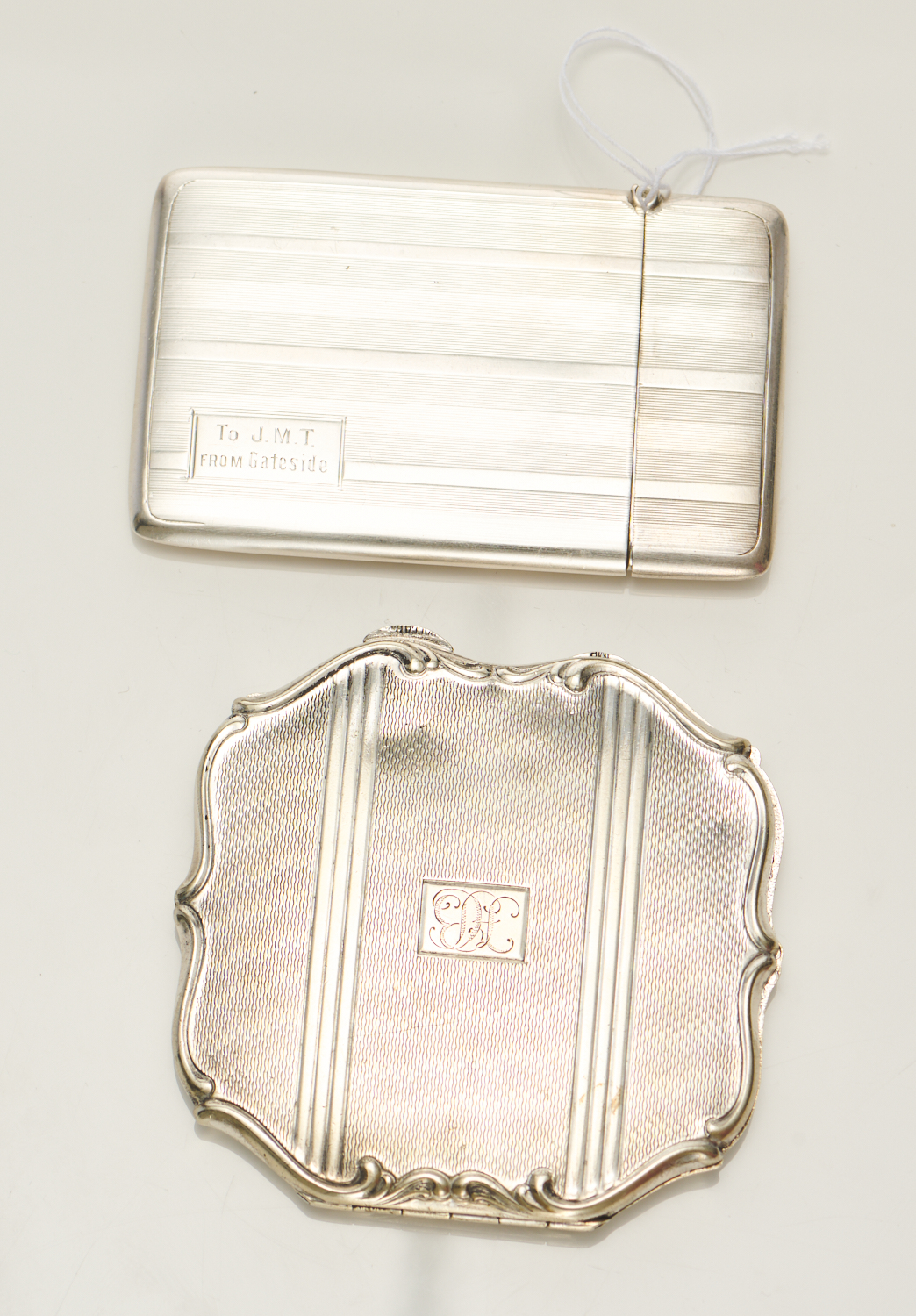 AN ENGLISH CIGARETTE CASE IN STERLING SILVER, WITH GUILLOCHÉ DECORATION, HALLMARKED BIRMINGHAM, CIRCA 1925-26, MAKER DEAKON & FRANCIS LTD, 8x5CMS, TOGETHER WITH A SILVER COMPACT CASE