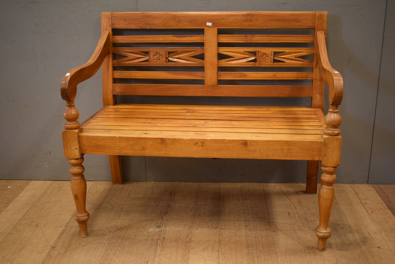 AN ORNATE TEAK TWO SEATER BENCH (A/F) (84H X 98W X 56D CM) (LEONARD JOEL DELIVERY SIZE: MEDIUM)